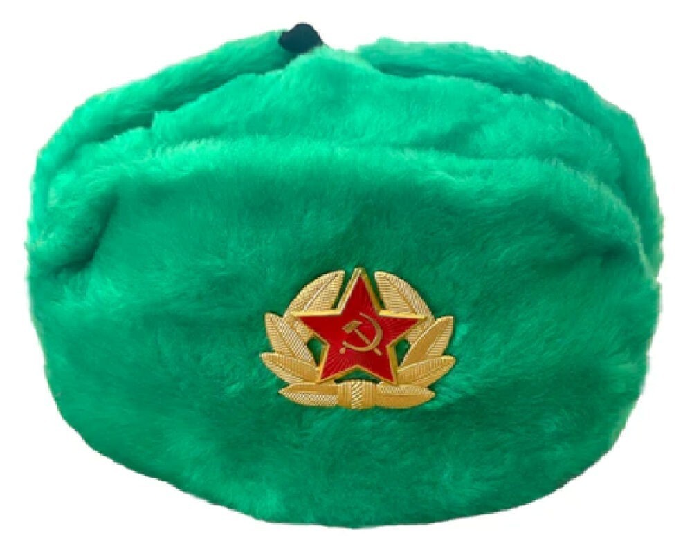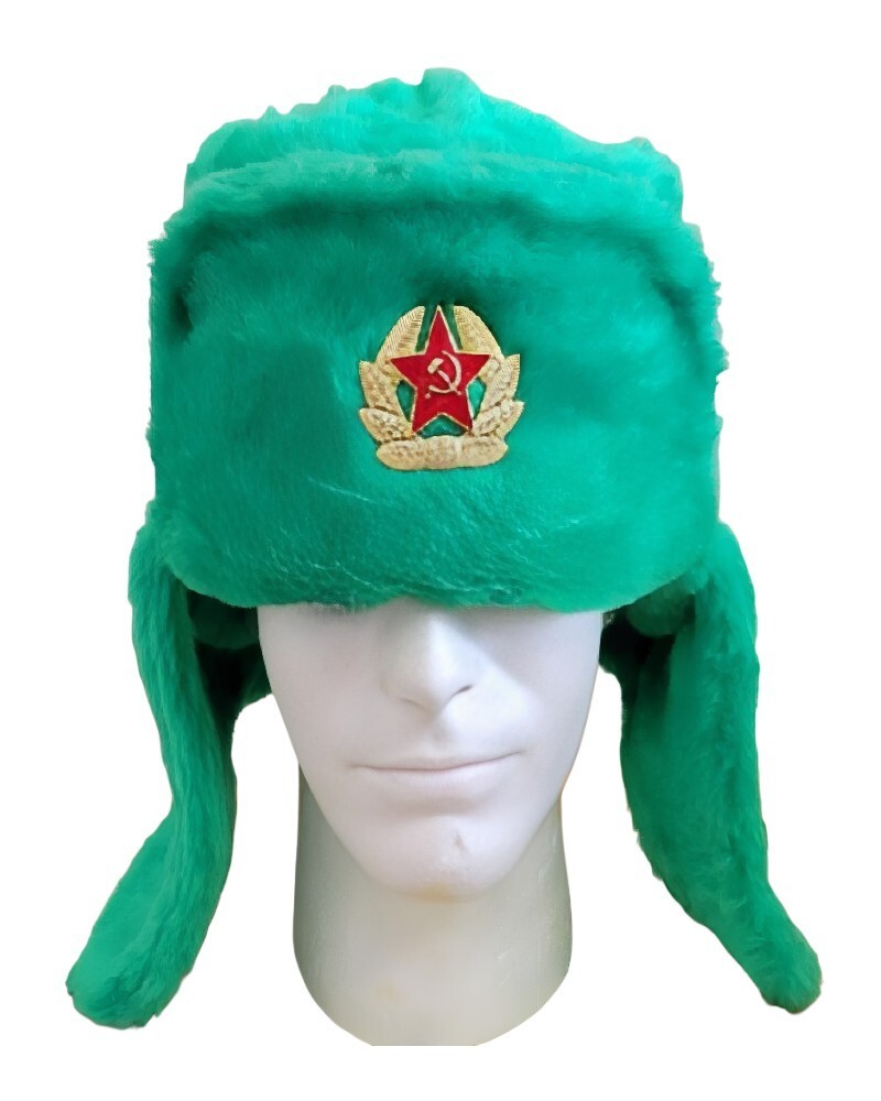 Ce chapeau de fourrure vert clair avec des volets d'oreille est chaud et confortable, parfait pour se proteger des vents et des tempetes de neige. Il est compose de fausse fourrure composee a 80% de laine et a 20% de polyester. Il est connu pour sa durabilite et sa resistance a la neige/a l?eau. Il possede une jolie doublure matelassee. En cas de besoin, l'insigne se detache facilement sans laisser de traces sur la fourrure. Ils peuvent etre portes avec des cache-oreilles vers le haut ou vers le bas. Fait au Belarus une ancienne republique de l'Union sovietique. Le chapeau est livre avec un insigne de l'armee rouge sovietique detachable.