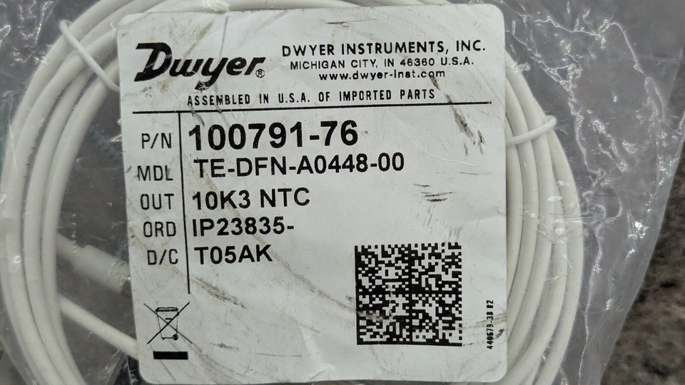 New Dwyer 100791-79 Air Duct Temp 4" Sensor Plenum Cable - TE-DFN-B0448-00