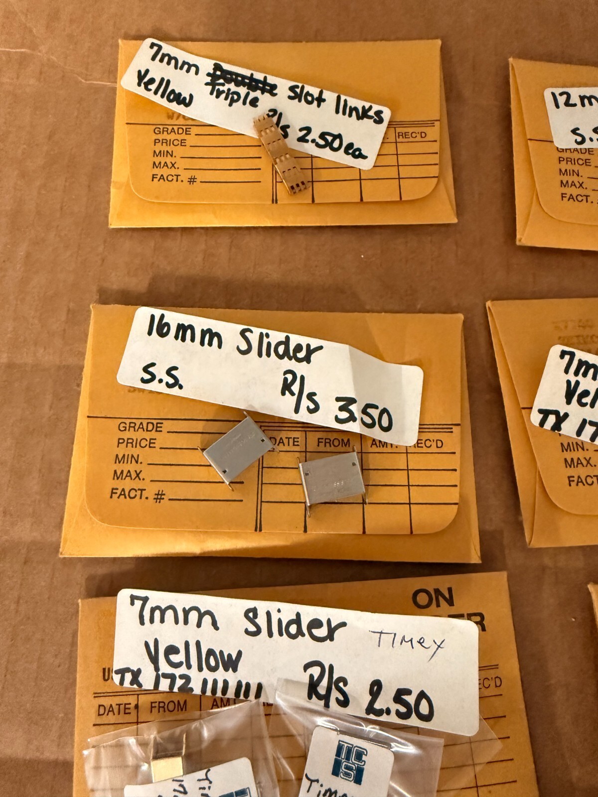 Vintage New LOT 1980's 70's Men's Ladies Timex Watch Slider Clasp Links 7mm Gold NOTE- these are all new and been sitting in storage for 40 years or more. See the pictures for what you get. THere is a big variety here. Some packs have multiples and some only 1. there are between 15-20 individual parts here. this is a piece of history. If you fix old watches you are in luck. I am not an expert on watches. I bought a big lot of old watch parts from a family watch-repair business that went to auction. They had been in business for 100 years. PLEASE - check out my other vintage watch parts we will be listing more over the next number of months. I will give you a deal if you want multiple orders!! FREE USA SHIP
