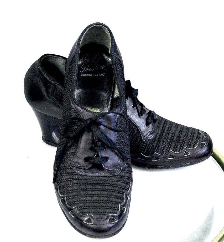 1930s-40s VTG Polly Preston Shoes Black Mesh Spectator Sz 6 C Oxford Rockabilly excellent wearable condition with only a small chip, on the patent leather heel. 2 1/4" chunky heel, these are sturdy and super cute . HARD TO FIND!