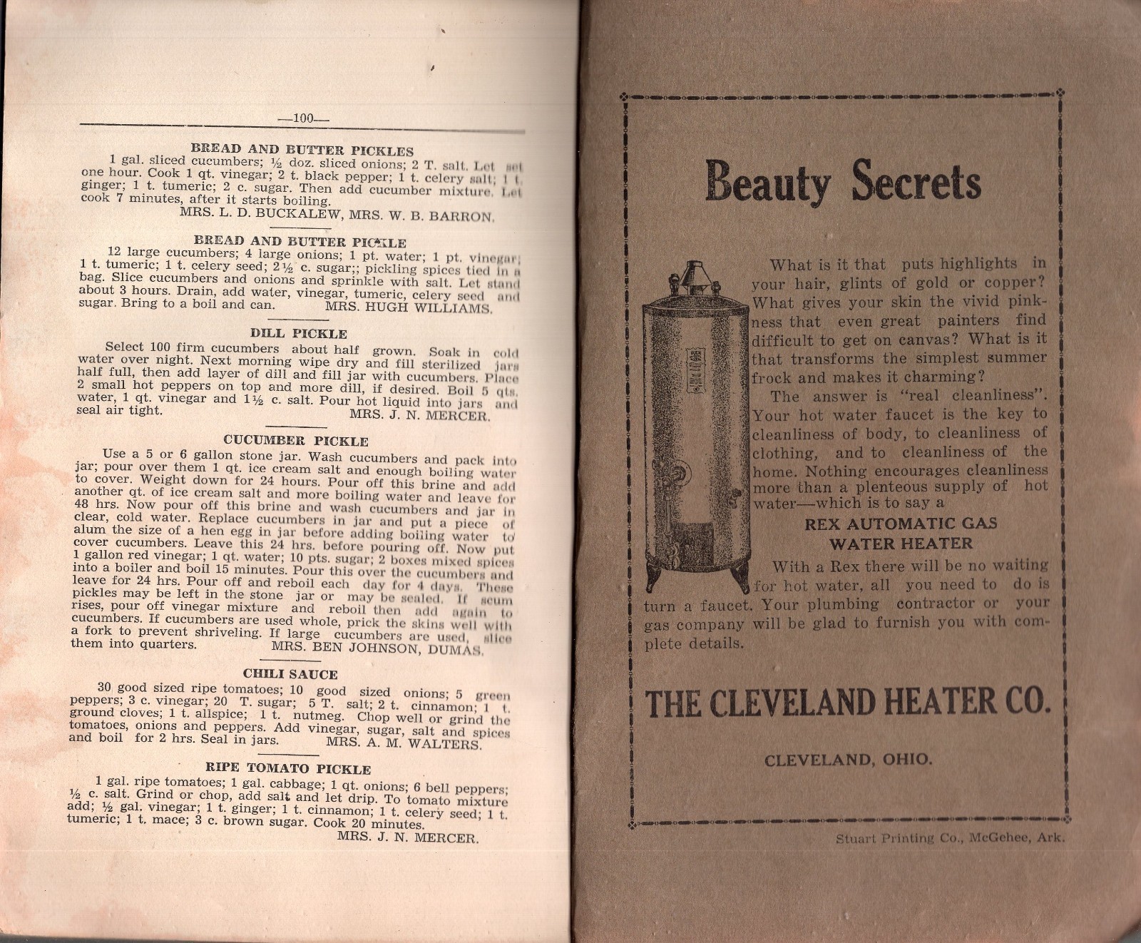 100 page cook book compiled by the McGehee Arkansas Garden Club. Recipes include Bread and Rolls, Soups, Fish and Meats, Vegetables, Drinks, Salads, Sandwiches and Fillings, Dessert, Ice Creams and Marlows, Pies, Cakes and Frosting, Cookies and Doughnuts, Confectionery, Pickles, Preserves, and Canning.