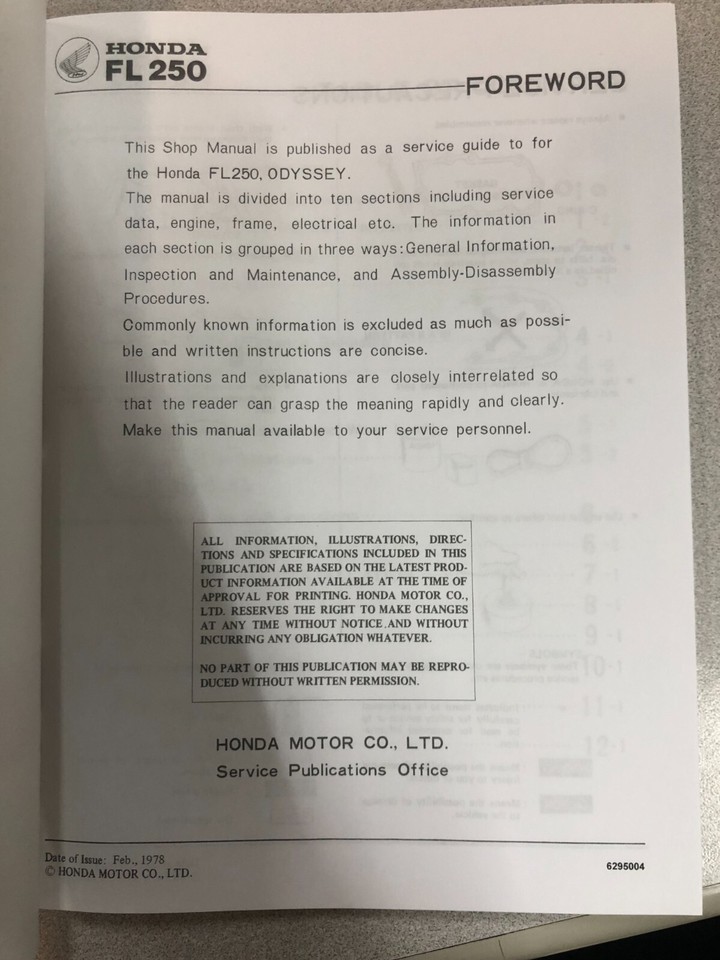 1977 1978 1979 1980 1981 FL250 Fl 250 Odyssey Atv Servizio Negozio Repair Manual