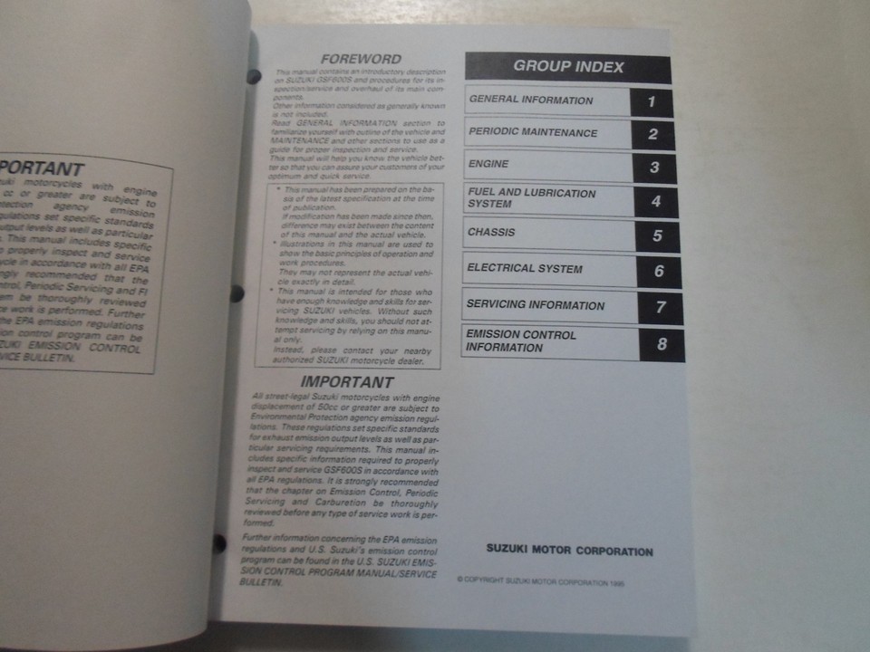 Beaucoup d'informations et illustrations, couvre beaucoup, pas de pages manquantes, des illustrations explosees et / ou des diagrammes, un grand manuel a avoir lorsque vous possedez un Suzuki GSF600s et qu'il gardera votre moto sur la route. Ce manuel vous fera economiser de l'argent Reparations/ /Service.