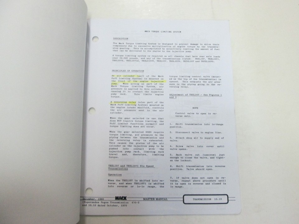 1998 MACK TRUCKS SYSTEME DE LIMITATION DE COUPLE MANUEL DE TRANSMISSION SERIE 107