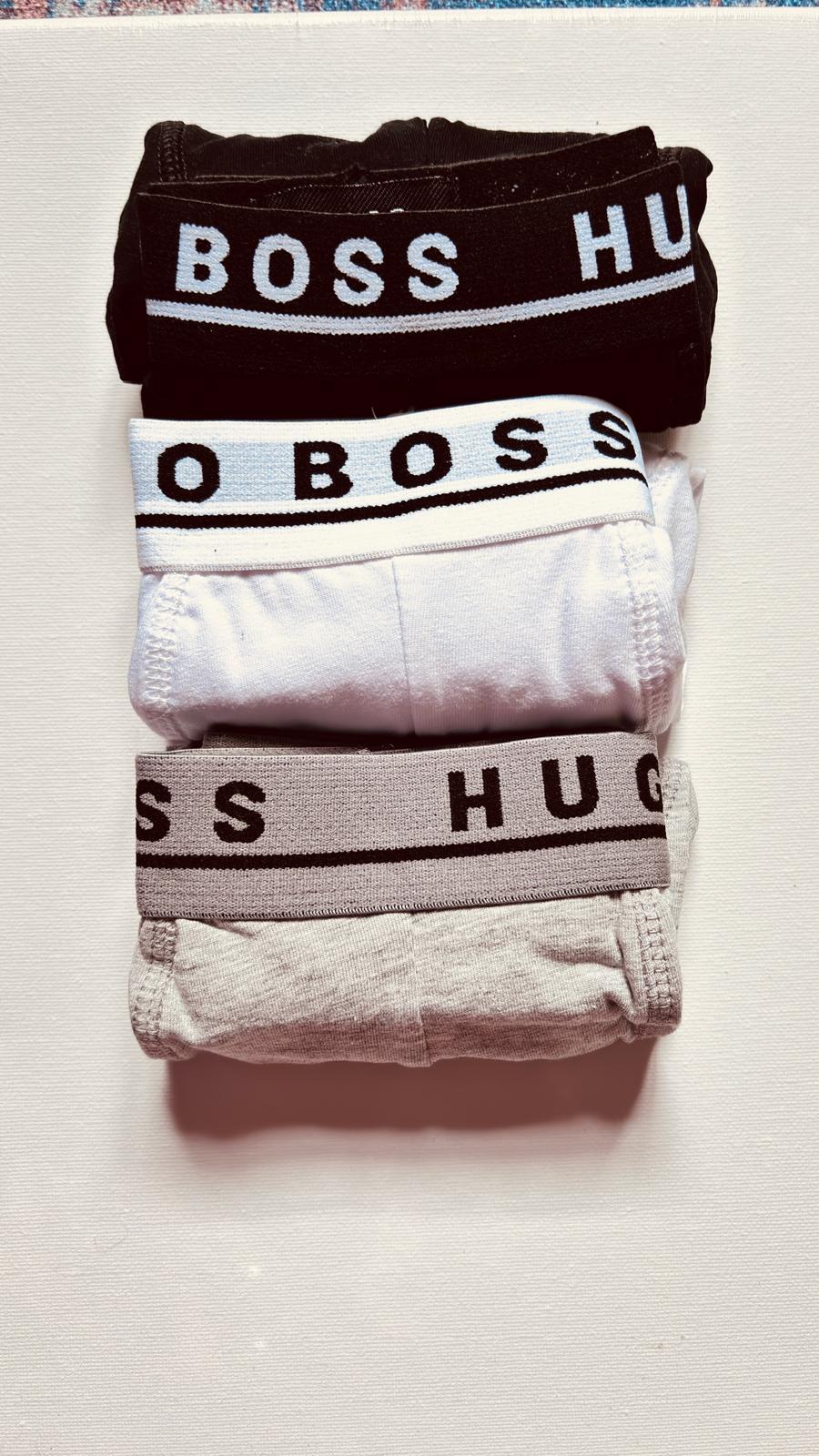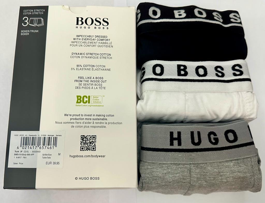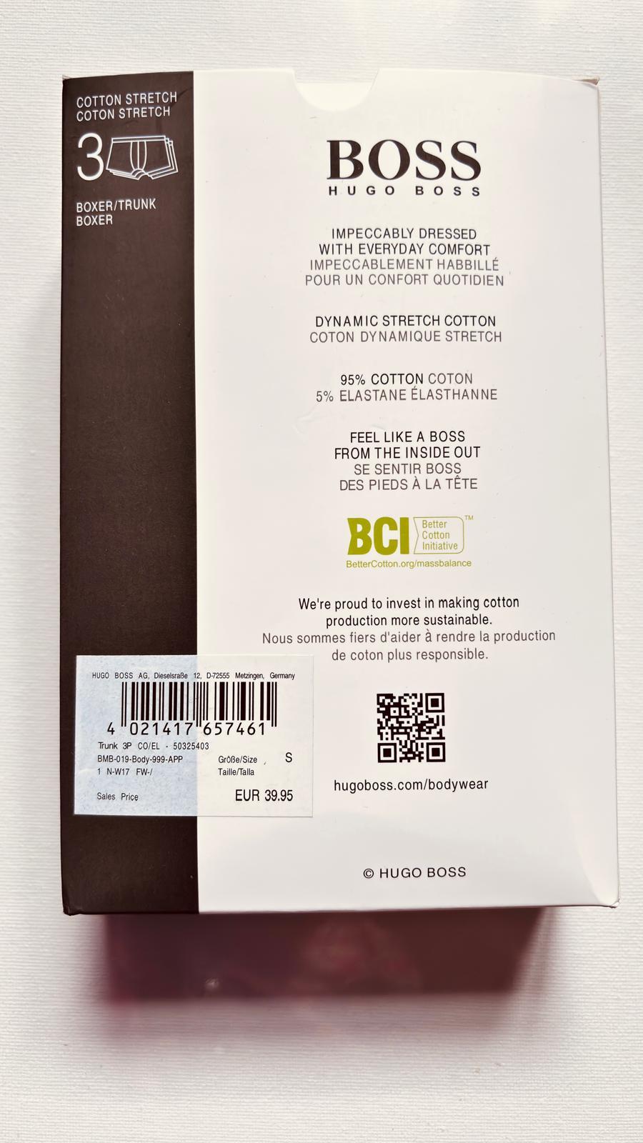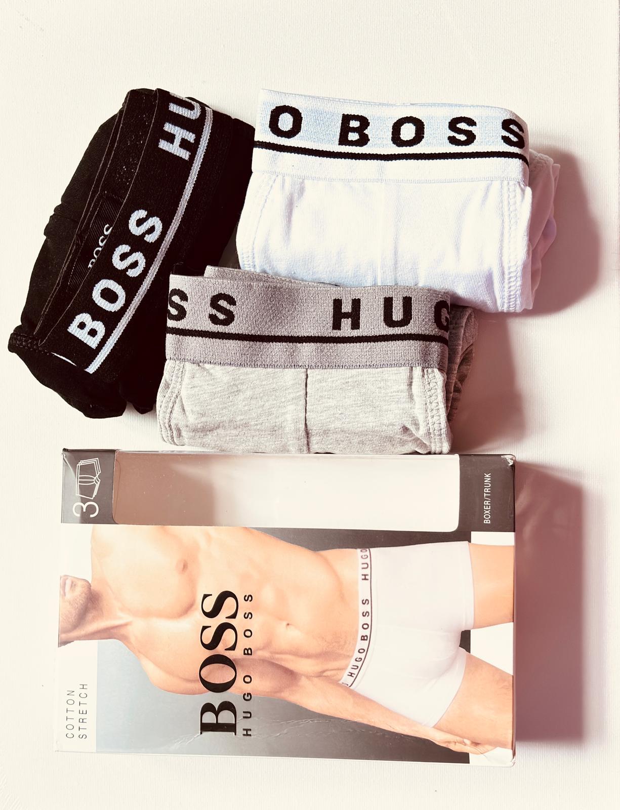 The Hugo Boss Men's 3 Pack Boxer Shorts, made from a soft cotton-elastane blend for breathability and stretch.seams for all-day comfort. in black cotton, offering a regular rise and exposed waistband with high customer ratings. size are availabel S/M/L/XL