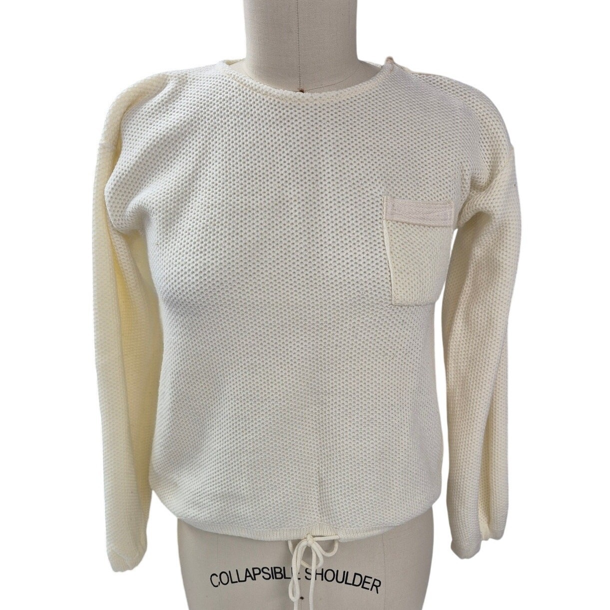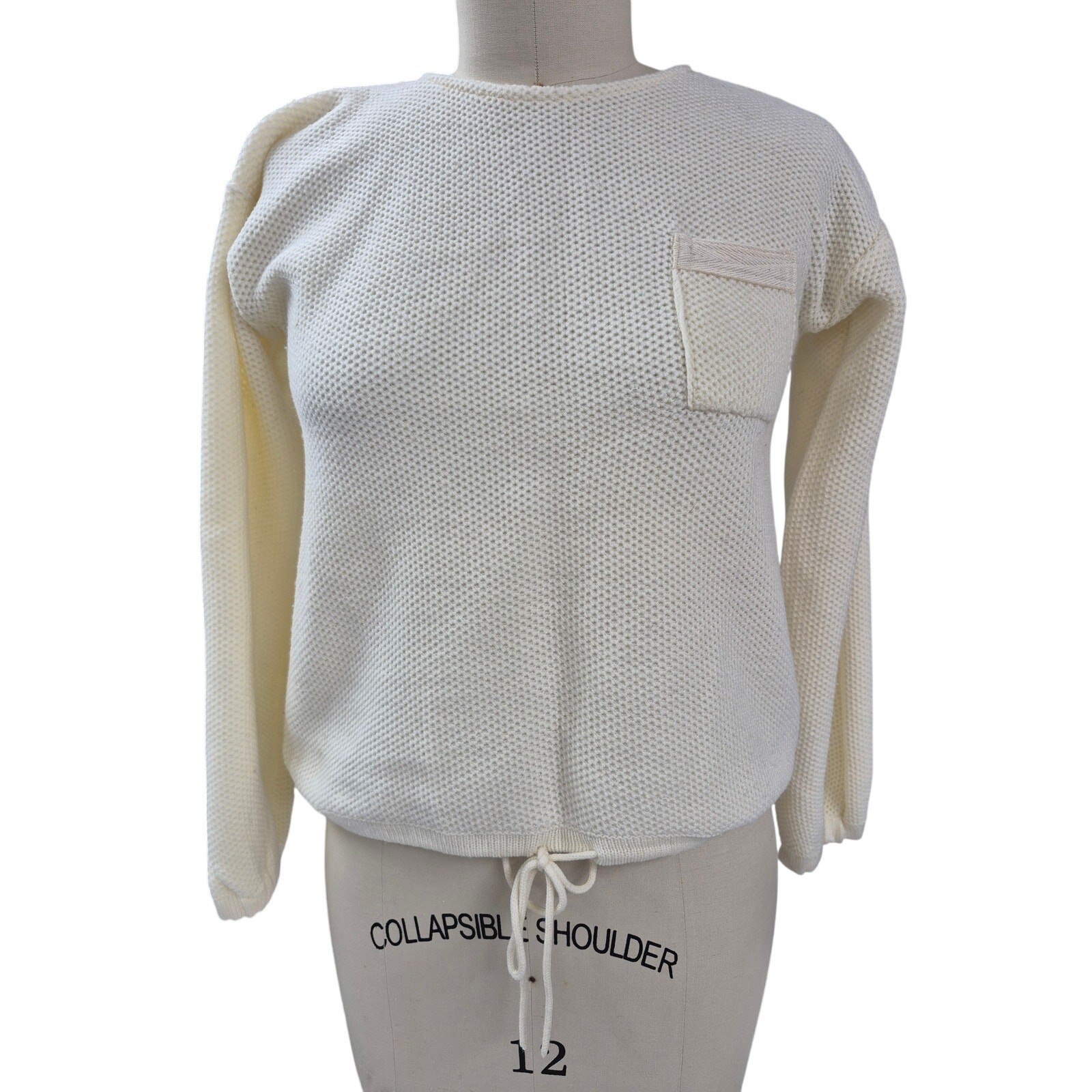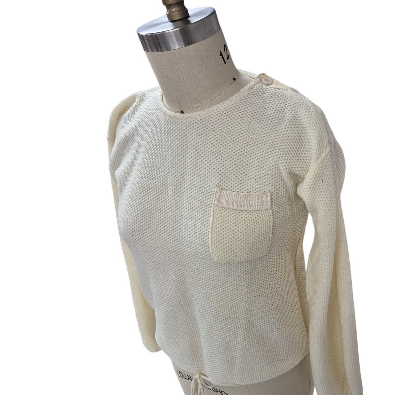 Vtg 70s 80s Ivory Whistle Stop 100% Acrylic Waffle Weave Top, Button Shoulder, Drawstring Waist, Women Size M, in as-found condition, no flaws noted. Made in Taiwan.