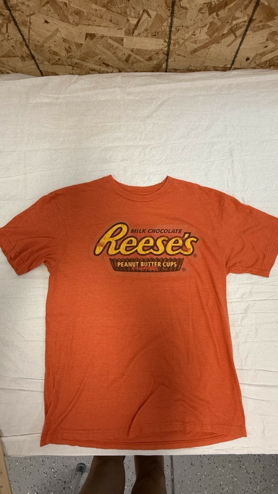 Has some crackling of logo giving it a vintage look. This Vintage 1980's Reese's Peanut Butter Cups two great tastes snack T-shirt in size L features a graphic print with a round neckline. Made of cotton and cotton blend material in orange color, this retro shirt is perfect for fans of 80s fashion and the iconic Reese's brand. Ideal for men who appreciate a classic and nostalgic piece with a whimsical peanut character design. Perfect for adding a touch of nostalgia to any casual wardrobe.