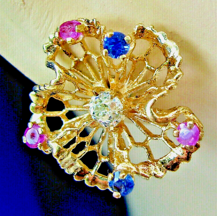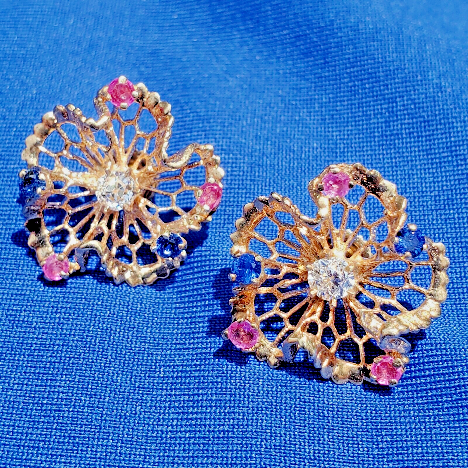 Earth mined Diamond Sapphire Ruby Deco Earrings Vintage Filigree Solid 14k Gold