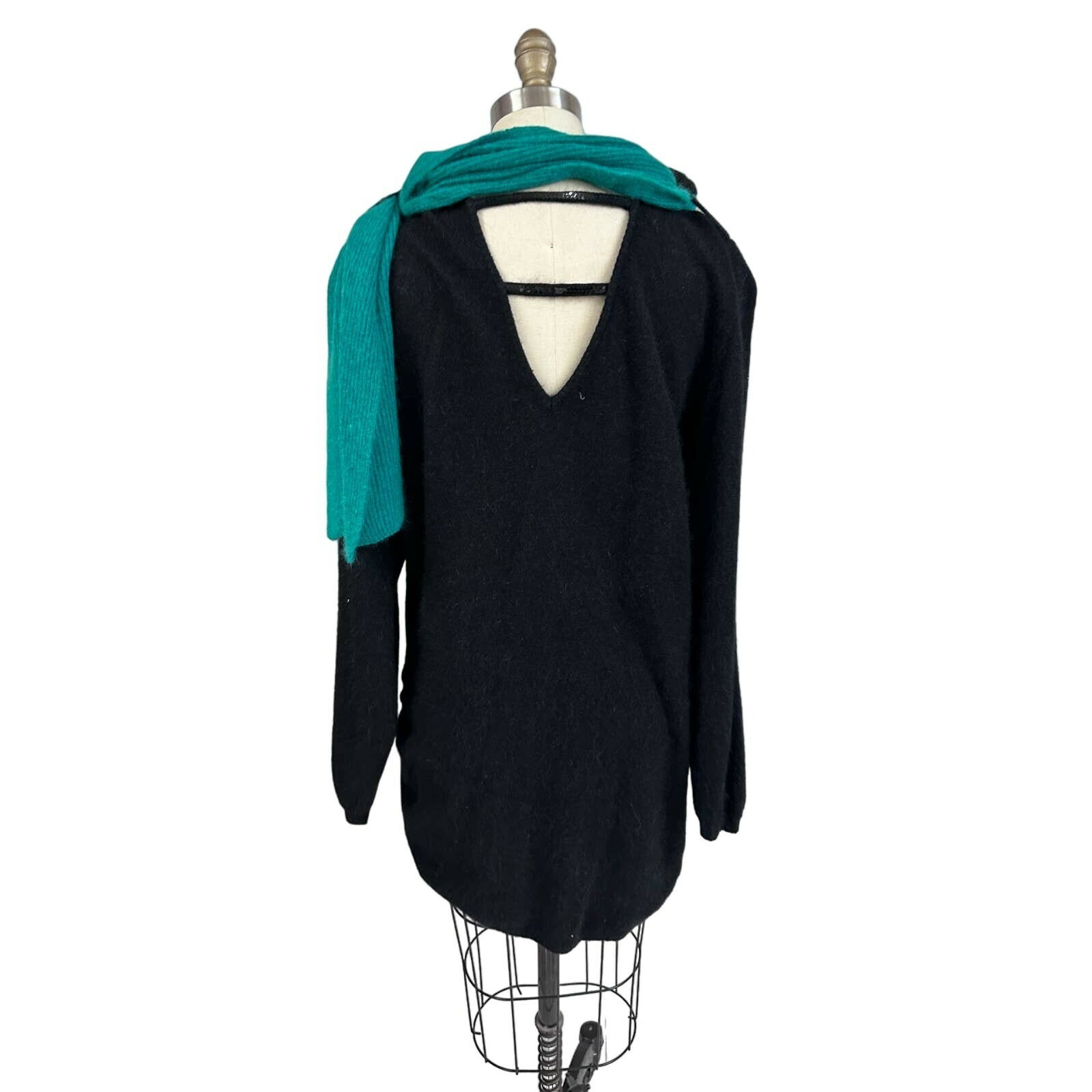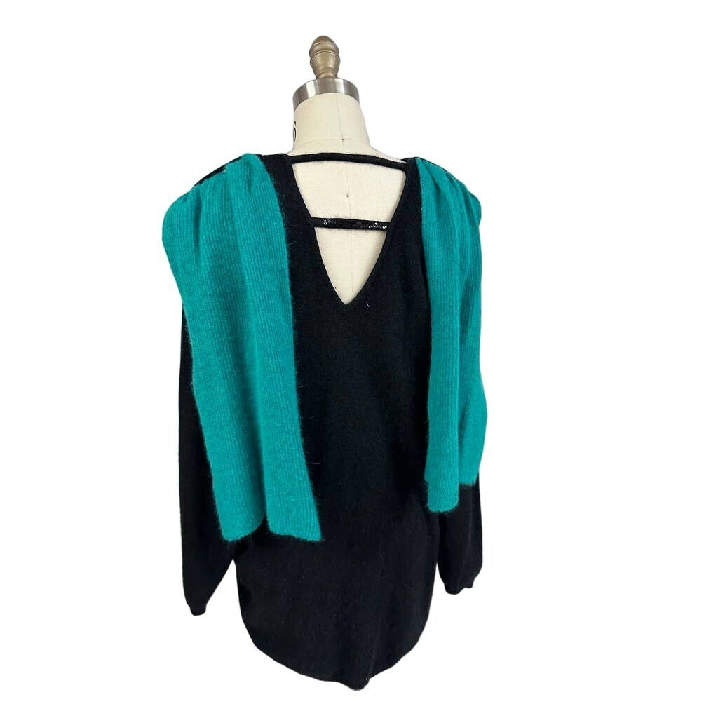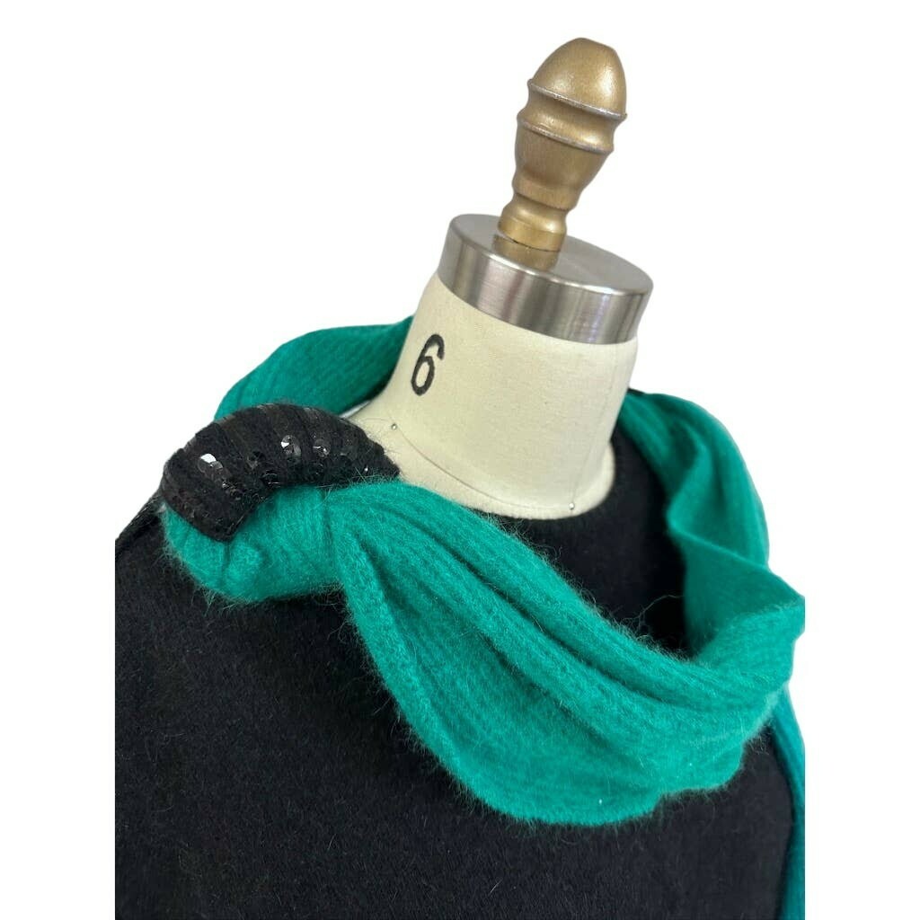 Striking vintage Frances La Vie black sweater dress with shimmering sequin details and an attachable green sequin scarf. Made in Italy from a luxurious angora/wool blend, it features an open back with sequin-accented bar straps, a ruched side accent for shaping, and long sleeves. The coordinating scarf measures 63" and completes the glamorous look. Excellent condition.