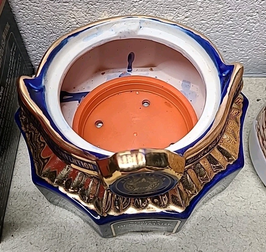 This collectible decanter set from Seagrams features a Fort Snelling tower design, with a blue ceramic material and American style. The set includes two items, with one 12-inch tower and a 7-inch width. The handmade set was manufactured in the United States in the 1970s and comes with its original box.