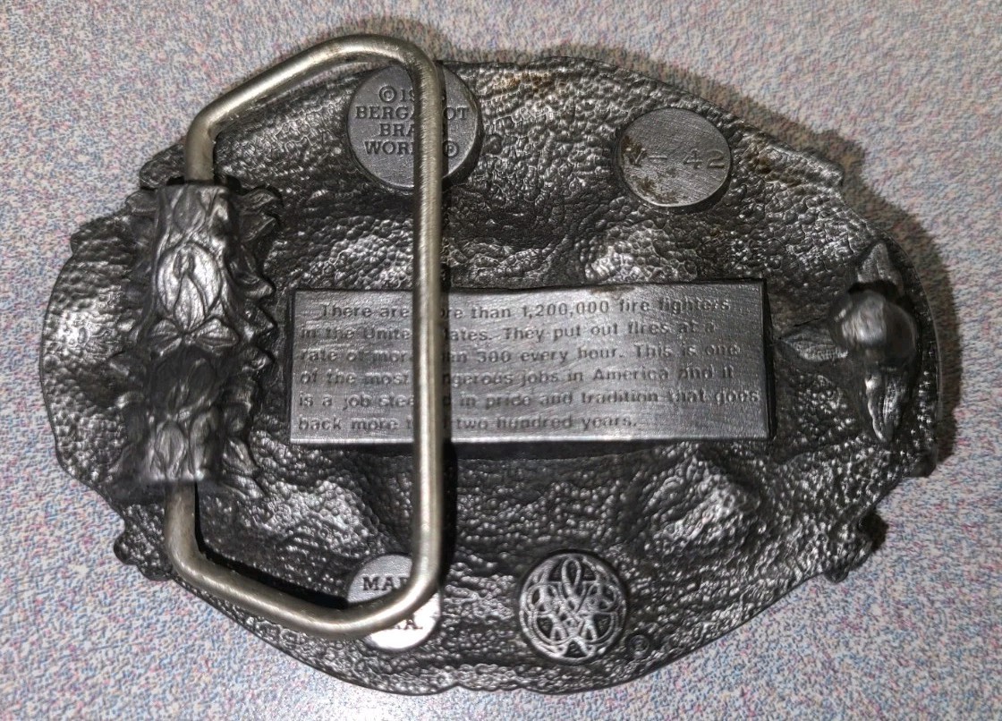The Vintage Belt Buckle from Bergamot Brass Work, made in the United States in 1986, proudly showcases the theme of being an American firefighter. This collectible piece of Western Americana culture features a design that pays tribute to the firefighting profession and the pride it evokes. The belt buckle serves as a unique and nostalgic accessory for collectors or enthusiasts of Western American history and firefighting memorabilia.