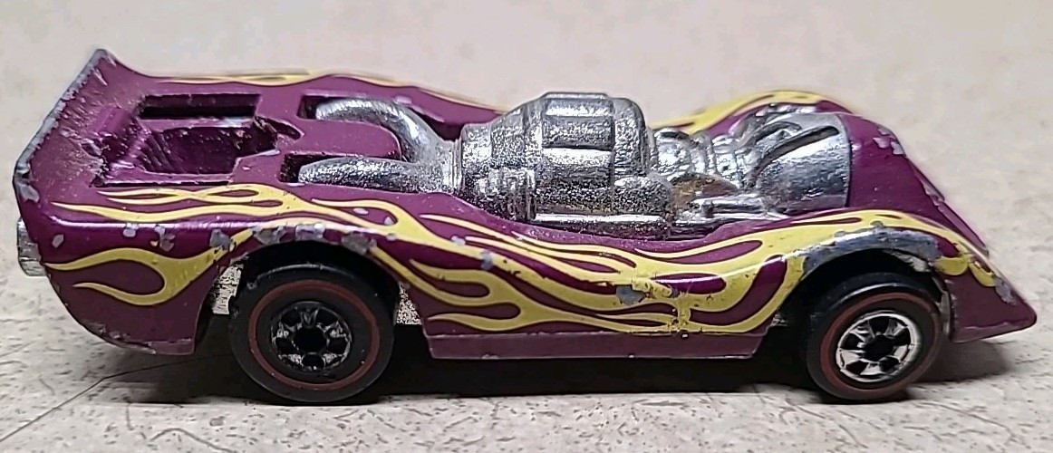 Hot Wheels - JET THREAT, 1970 Redline, Plum w/ Yellow Flames, Hong Kong