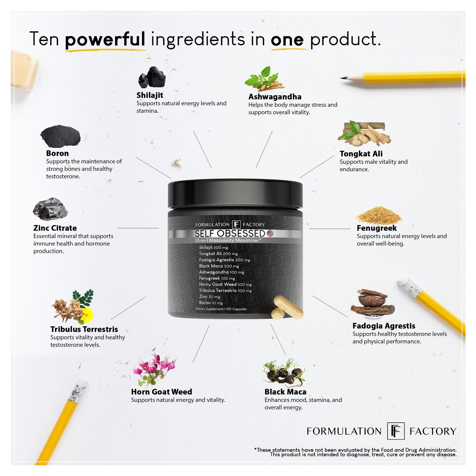 Self Obsessed 10 in 1 Masculinity Maximizer Supplement, Shilajit for Men, Tongkat Ali, Ashwaganda, Fenugreek Muscle Growth, Energy, Drive, Strength, Recovery 2 Month (Pack of 1)