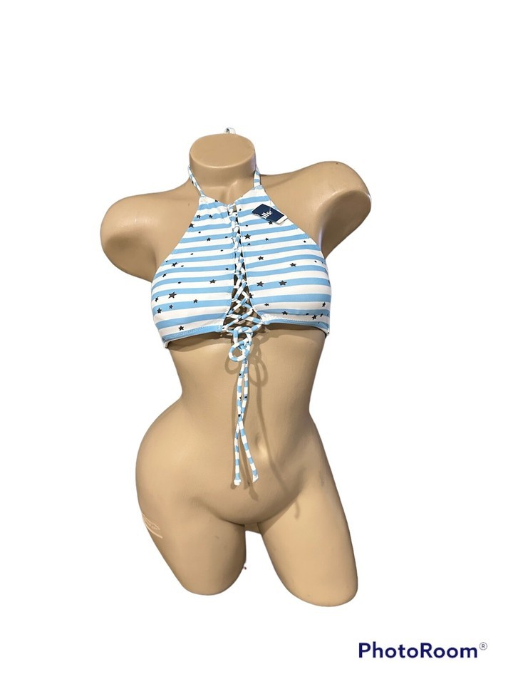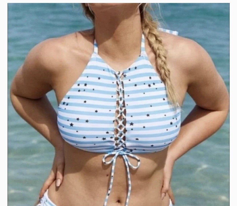 Aerie Stars Stripes Lace Up Halter Bikini Top White Blue Medium New NWT.