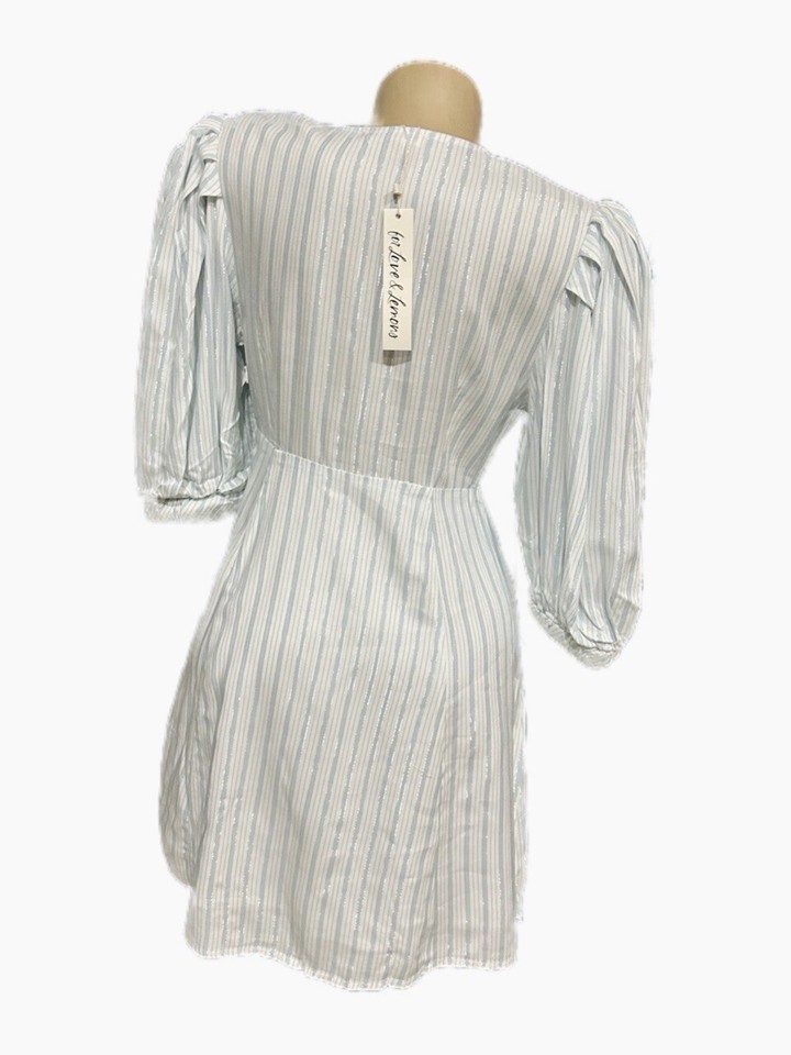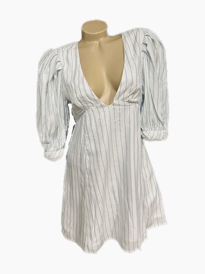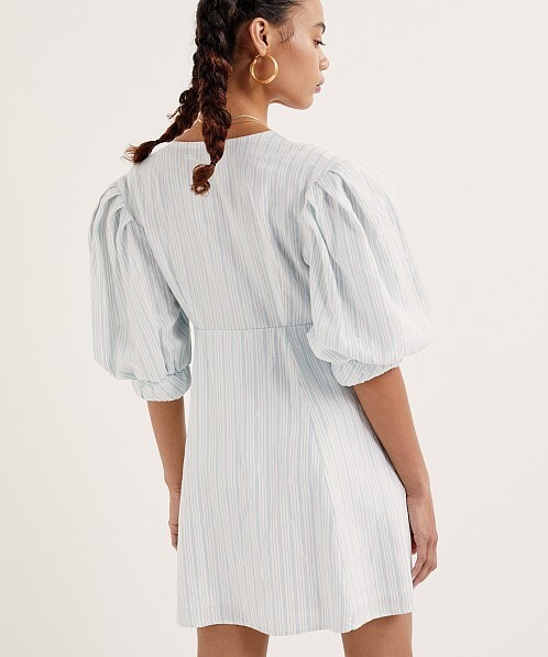 Picnic-ready mini dress featuring thin shimmering lurex stripes and a plunging neckline. Puff sleeves have a structured cuff with twisted detailing. Roomy skirt.