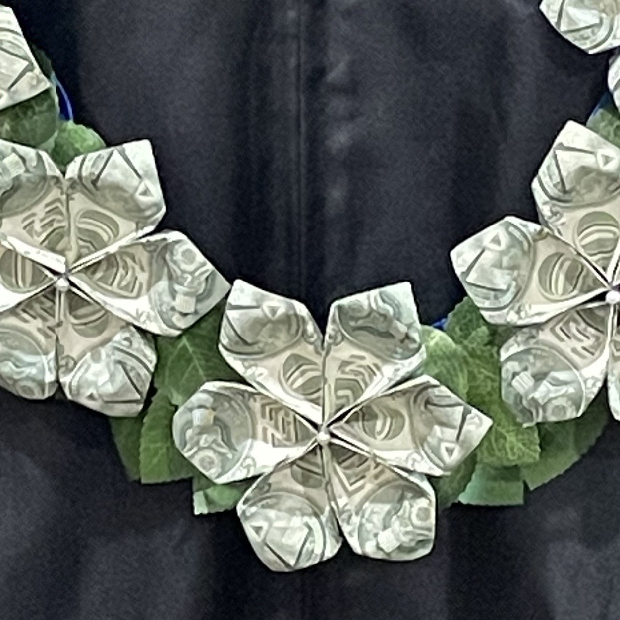 Graduation Party Money Lei Flower & Leaves Crisp Bills Blue Four Braided Ribbons