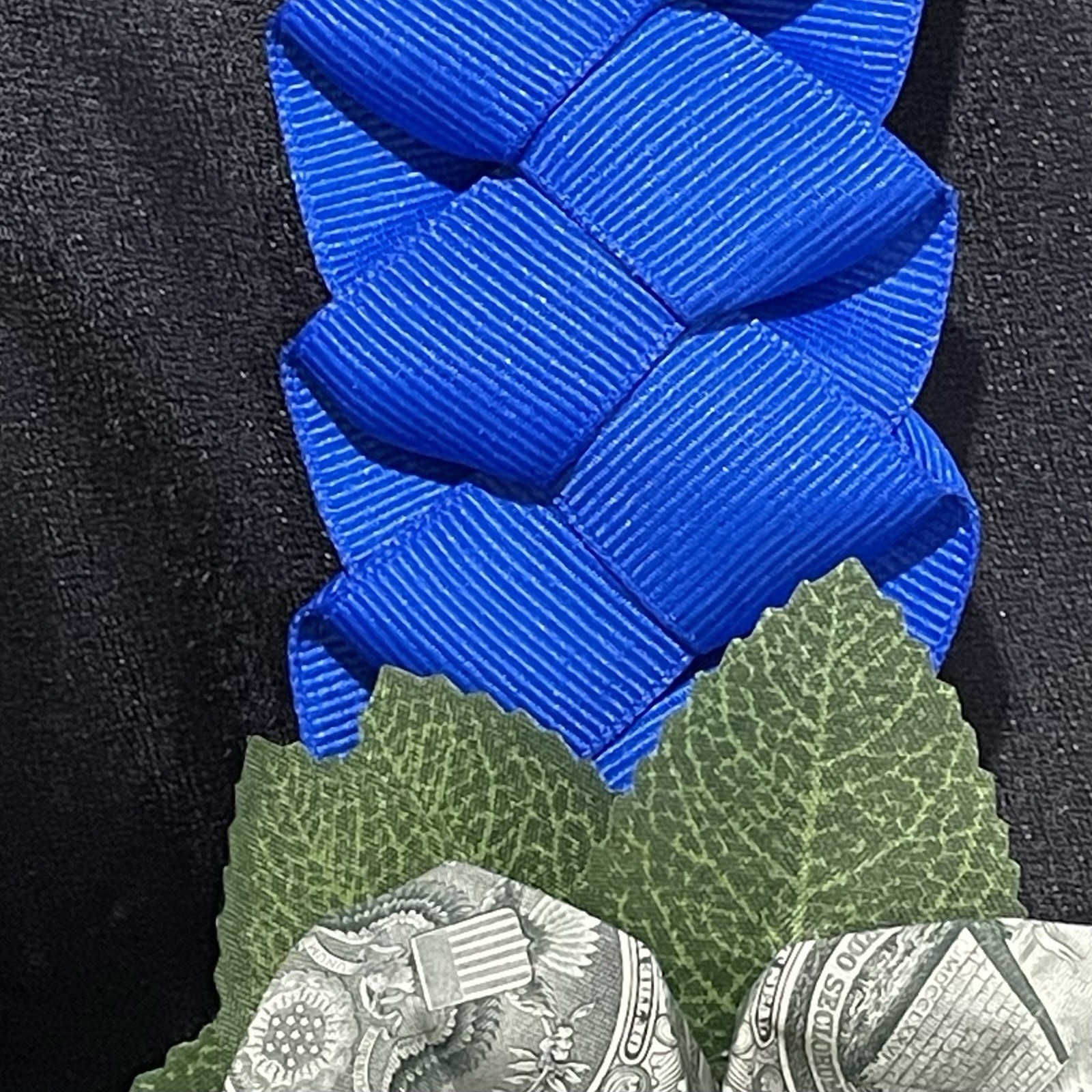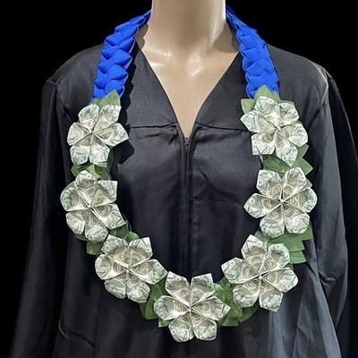 Gorgeous upgraded blue grosgrain ribbon 4 strand braided lei with leaves. Folded flowers made with one dollar bills. Each flower is $3 so it has $21 on it (7 flowers) plus leaves. It hangs approximately 19? and the width of the braid is approximately 2? wide. Each money flower has a pearl bead in the center.