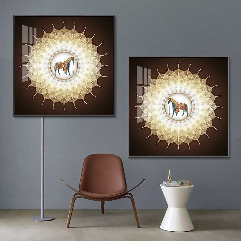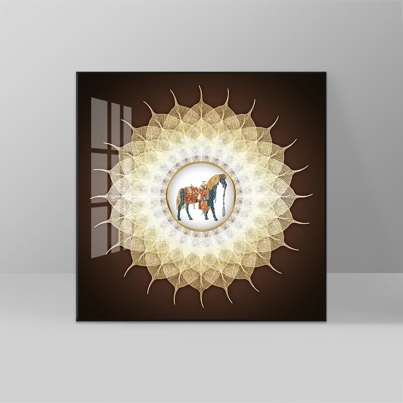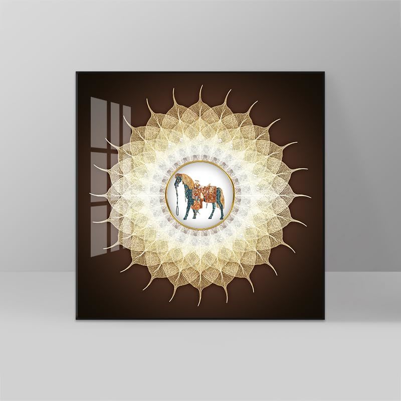 Product description: Transform your living space with this stunning Modern Bodhi Leaf Crystal Ceramic Wall Art Set. Each of the two pieces measures an impressive 24 x 24 inches, creating a captivating focal point wherever displayed. Crafted using advanced crystal ceramic vacuum pour technology, these decorative panels boast exceptional clarity, brilliant gloss, and remarkable color longevity that won't fade over time. The sophisticated design features intricate Bodhi leaf patterns and radiant sunburst motifs surrounding an elegant horse centerpiece, all encased in a premium black aluminum frame that adds contemporary elegance to any room. Perfect for living rooms, above sofas, in bedrooms, entrances, or corridors, this versatile set elevates your interior design with its artistic presence. The crystal ceramic construction ensures these pieces are not only visually striking but also durable and easy to maintain. Whether arranged as a pair or separated for visual interest throughout your home, this wall art set brings refined artistry and modern sophistication to transform ordinary walls into extraordinary gallery-worthy displays.