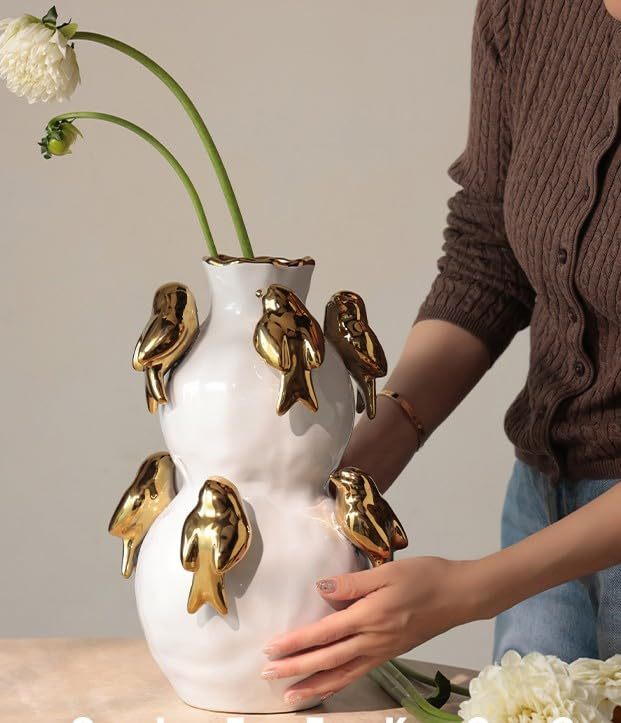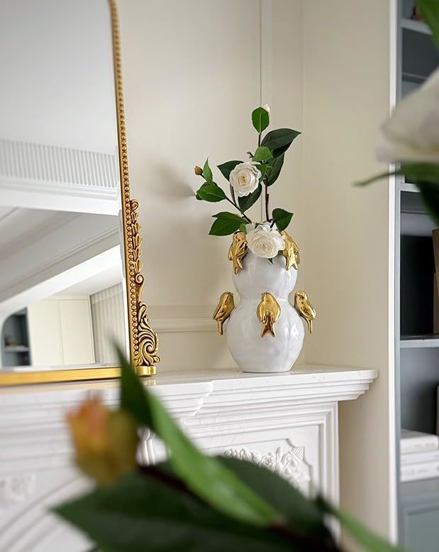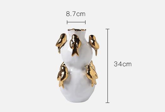 Product description: Elevate your space with this striking white ceramic vase adorned with delicate golden birds. Standing 13.4 inches tall, this minimalist vessel combines clean, contemporary design with artistic sophistication. The pristine white ceramic body serves as an elegant canvas for five meticulously crafted gold-plated bird appliques that create captivating dimensional detail as they appear to perch gracefully around the vase's surface. The thoughtful contrast between the pure white ceramic and lustrous gold accents adds visual drama while maintaining refined elegance. With its slender 3.4-inch width profile and smooth surface, this versatile piece works beautifully as both a functional flower vessel and a standalone sculptural accent. The strategic placement of the golden birds brings organic movement and life to the geometric form, making it an eye-catching addition to any modern interior. Whether displayed on a console table, mantel, or as a sophisticated centerpiece, this ceramic vase artfully balances minimalist design with luxurious details.