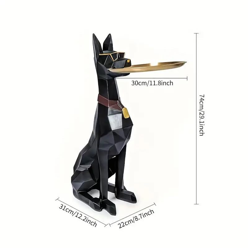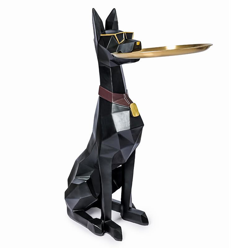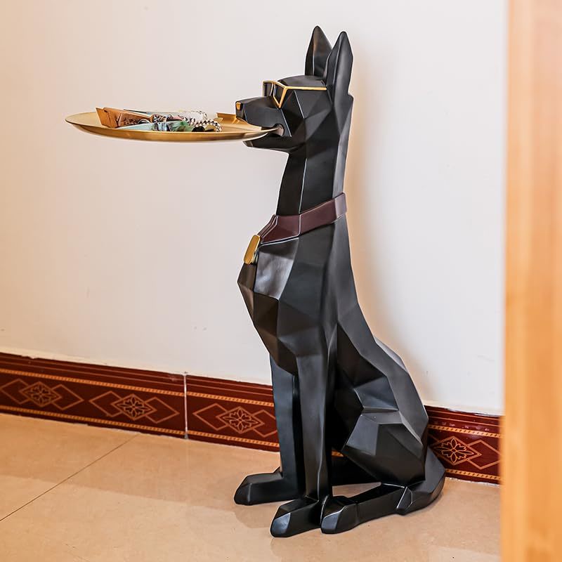 Product description: Make a bold artistic statement with this striking Large Geometric Doberman Side Table that seamlessly merges sculptural design with practical functionality. Standing at 29 inches tall, this contemporary polygonal masterpiece features dramatic angular facets crafted from durable polyresin in a sophisticated black finish. The integrated golden storage tray provides an elegant solution for displaying and organizing everyday items. Perfect as an entryway accent, TV console companion, or bedside table, its commanding presence transforms any space into a modern art gallery. The geometric patterns create stunning visual drama while maintaining practical utility. This versatile piece works beautifully in contemporary interiors, appealing to both art enthusiasts and those seeking distinctive furniture. The contrasting black and gold color scheme adds luxurious sophistication to any decor setting. Each angle and facet has been thoughtfully designed to reflect light and create ever-changing shadows, making this functional sculpture a true conversation starter.