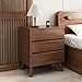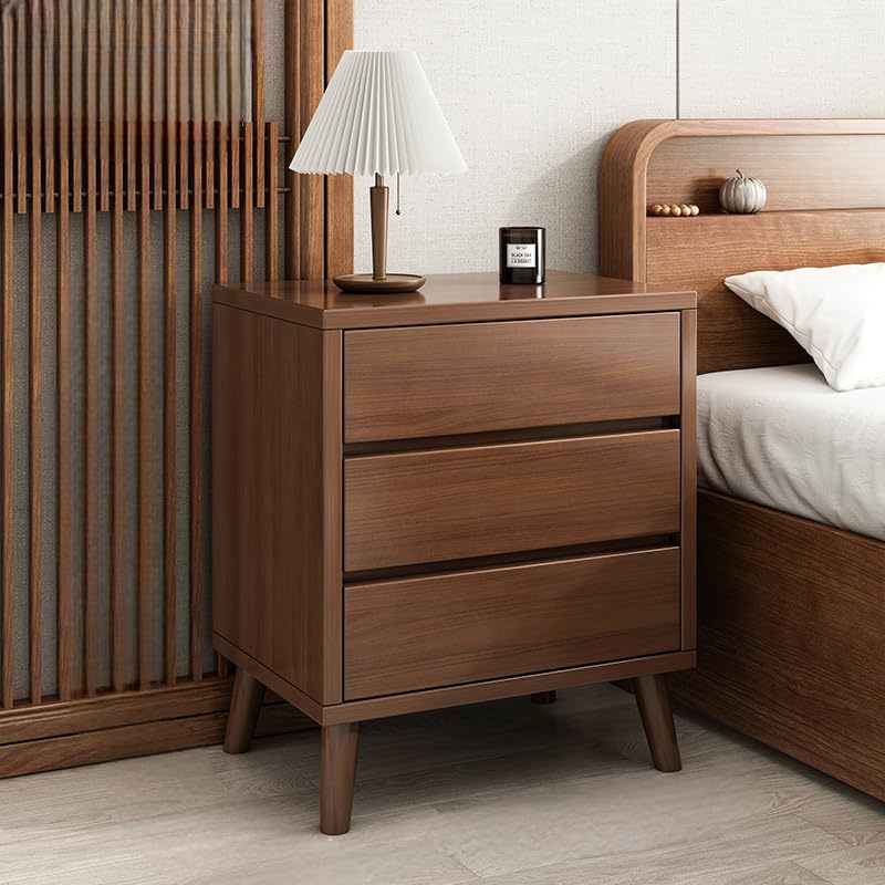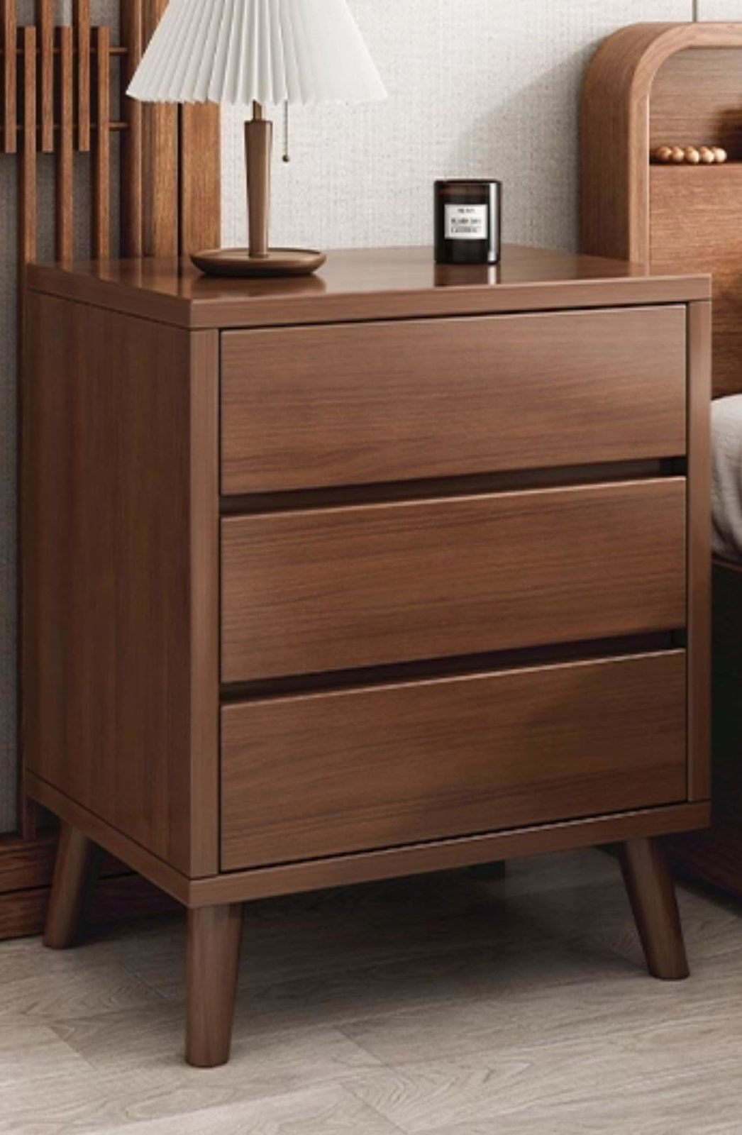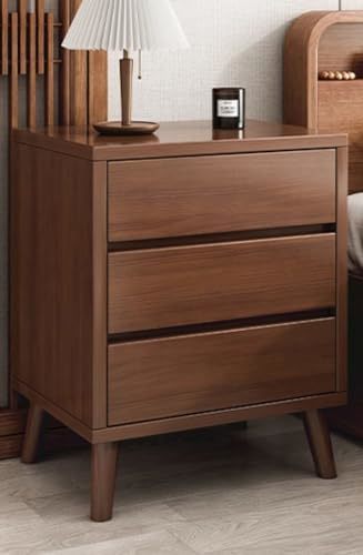 Product description: Elevate your bedroom with this Interoknack Modern Solid Wood Bedside Table, thoughtfully designed for those who appreciate minimalist elegance and practical storage. Standing at 24.4 inches tall with a compact footprint of 17.7 x 15.7 inches, this narrow nightstand is perfect for smaller spaces while providing maximum functionality. The natural wood construction showcases beautiful grain patterns that complement modern, Nordic, and minimalist interior styles. Three smooth-gliding drawers offer generous storage for personal items, books, electronics, and bedside essentials while maintaining a clean, uncluttered surface. The elevated design with stylish mid-century inspired feet not only adds visual lightness but also allows for easy cleaning underneath. Versatile enough to serve as a nightstand, end table, or compact storage cabinet, this solid wood piece brings both warmth and organization to bedrooms, living spaces, or dormitories. The sleek cut-out handles enhance the clean lines and contemporary appeal of this thoughtfully crafted furniture piece.