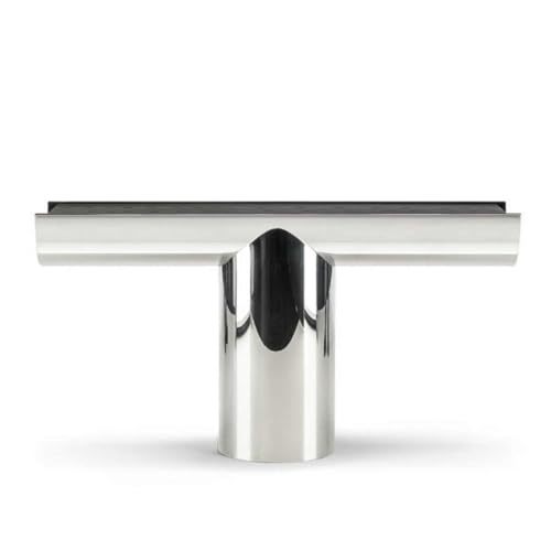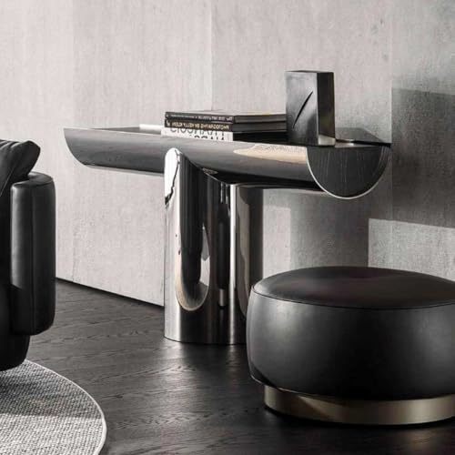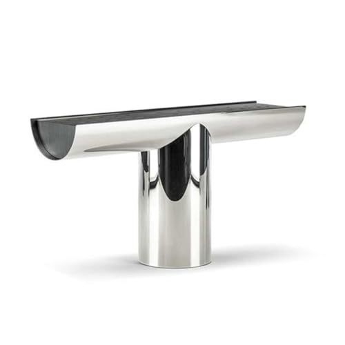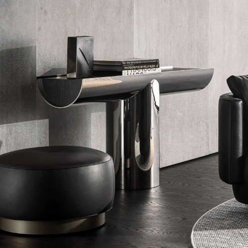 Product description: Elevate your living space with this striking Italian minimalist console table that masterfully combines form and function. The sleek T-shaped silhouette features a dramatic black ash veneer top supported by a mirror-polished cylindrical stainless steel base, creating an architectural statement piece. Measuring 47.2 inches long, 13.7 inches wide, and 33.4 inches high, this versatile table fits perfectly in entryways, hallways, or as a sophisticated accent in living rooms. The premium black ash tabletop showcases natural wood grain patterns while providing ample surface area for displaying art pieces, vases, or cherished collections. The robust stainless steel frame ensures exceptional stability and durability while maintaining clean, minimalist lines that complement contemporary interiors. Its thoughtful proportions and understated elegance make it an ideal choice for both residential spaces and upscale commercial environments. The smooth surfaces are designed for easy maintenance, perfect for high-traffic areas where style meets practicality.