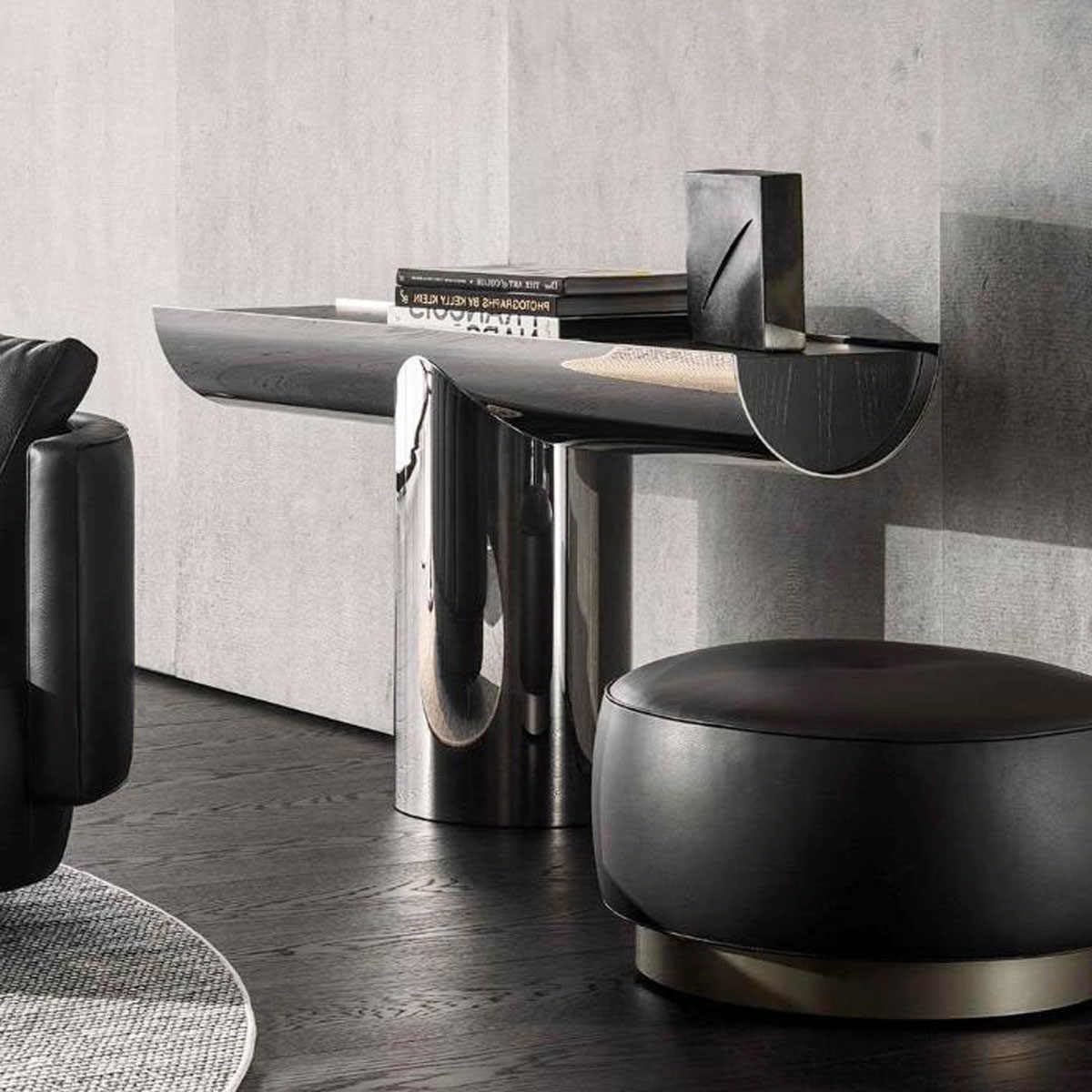 Elevate your living space with this striking Italian minimalist console table that masterfully combines form and function. The sleek T-shaped silhouette features a dramatic black ash veneer top supported by a mirror-polished cylindrical stainless steel base, creating an architectural statement piece. Measuring 47.2 inches long, 13.7 inches wide, and 33.4 inches high, this versatile table fits perfectly in entryways, hallways, or as a sophisticated accent in living rooms. The premium black ash tabletop showcases natural wood grain patterns while providing ample surface area for displaying art pieces, vases, or cherished collections. The robust stainless steel frame ensures exceptional stability and durability while maintaining clean, minimalist lines that complement contemporary interiors. Its thoughtful proportions and understated elegance make it an ideal choice for both residential spaces and upscale commercial environments. The smooth surfaces are designed for easy maintenance, perfect for high-traffic areas where style meets practicality.