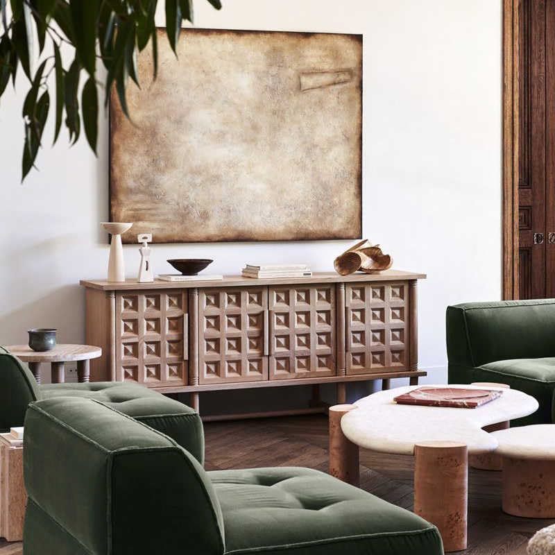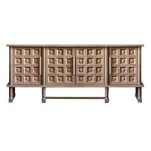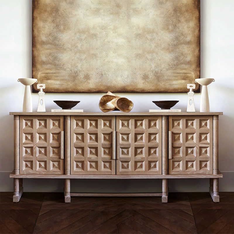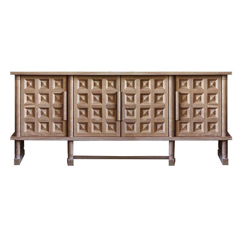 Product description: Transform your living space with this exquisite French Vintage TV Console Cabinet, a masterpiece that seamlessly blends rustic charm with sophisticated functionality. Crafted from solid wood with a weathered oak finish, this substantial piece measures 82.7 x 17.7 x 32.7 inches and features stunning hand-carved diamond patterns across its four doors, creating an enchanting play of light and shadow that adds depth and character to any room. The elevated trestle base with elegantly turned legs provides both stability and visual lightness, while maintaining easy floor access for cleaning. Behind the intricately carved doors lies generous storage space perfect for media equipment, gaming consoles, and entertainment accessories. The spacious top surface accommodates large televisions while leaving room for decorative displays. Whether used as a media console, dining room sideboard, or entryway credenza, this versatile piece showcases traditional joinery techniques and hand-finished surfaces that make each cabinet uniquely beautiful. The carefully distressed finish and aged patina tell a story of timeless elegance, making it a striking centerpiece that adapts beautifully to various interior styles.