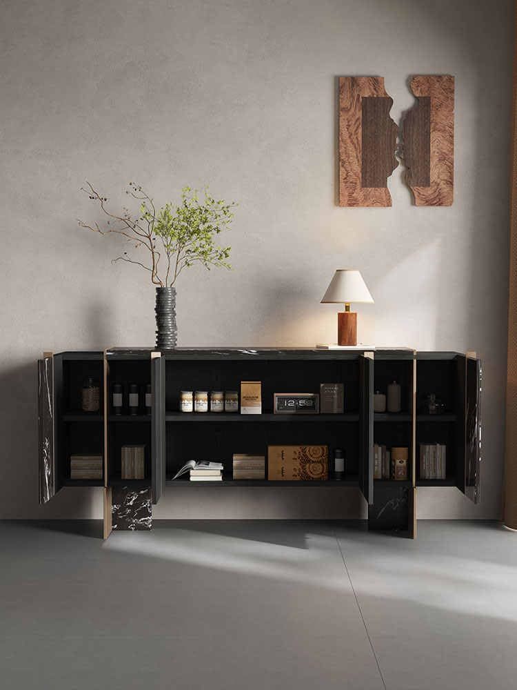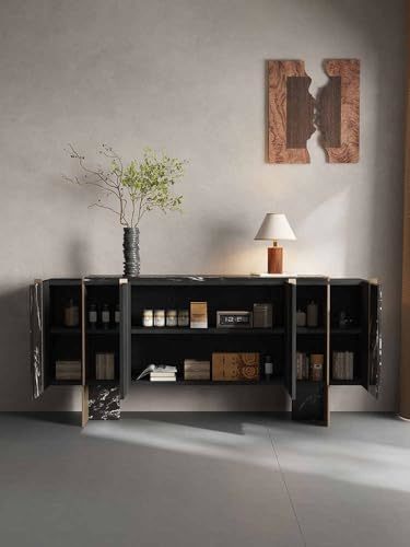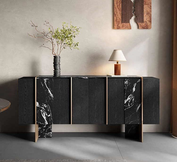 Product description: Transform your living space with this sophisticated Modern Vintage Black Oak Sideboard Buffet, a masterful fusion of luxury and functionality. Crafted from solid black oak and adorned with striking black marble accents, this 63-inch wide cabinet makes a bold statement in any upscale setting. The geometric six-door design conceals generous storage space, perfect for organizing dinnerware, decor, or everyday essentials. Standing at 35.4 inches tall with a depth of 15.7 inches, this versatile piece serves beautifully as a buffet, entryway cabinet, or storage console. The water-resistant surfaces and durable construction ensure lasting elegance, while the wide-set base provides stable support for your treasured items. Its timeless design seamlessly integrates with minimalist, retro, or contemporary interiors, making it an ideal addition to luxury homes and villas where refined style meets practical storage solutions.
