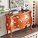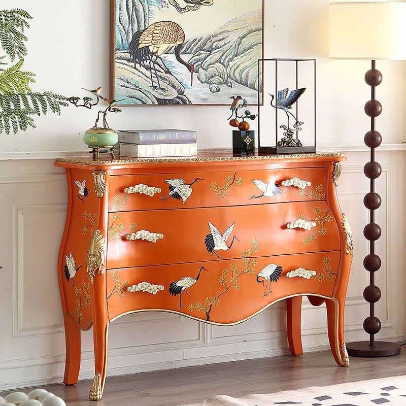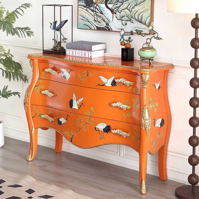 Product description: Elevate your interior with this exquisite French Chinoiserie Orange Lacquered Console from Interoknack. This stunning piece showcases hand-painted flying crane motifs on a vibrant orange lacquer finish, masterfully blending 18th-century European design with Chinese artistic traditions. The classic bombe silhouette features elegant cabriole legs and graceful curves that exemplify sophisticated French furniture craftsmanship. Measuring 39.4 x 15.7 x 29.9 inches, this versatile console provides both visual drama and practical storage solutions. The intricate 'Song He Yan Nian' artwork depicts majestic cranes soaring through stylized clouds, incorporating traditional symbols of longevity into its decorative appeal. The rich orange lacquer finish with gold accents creates a striking focal point suitable for entryways, living spaces, or bedrooms. This statement piece combines the finest elements of French furniture making with Chinese decorative arts, perfect for collectors and design enthusiasts who appreciate cultural fusion in their interior spaces.