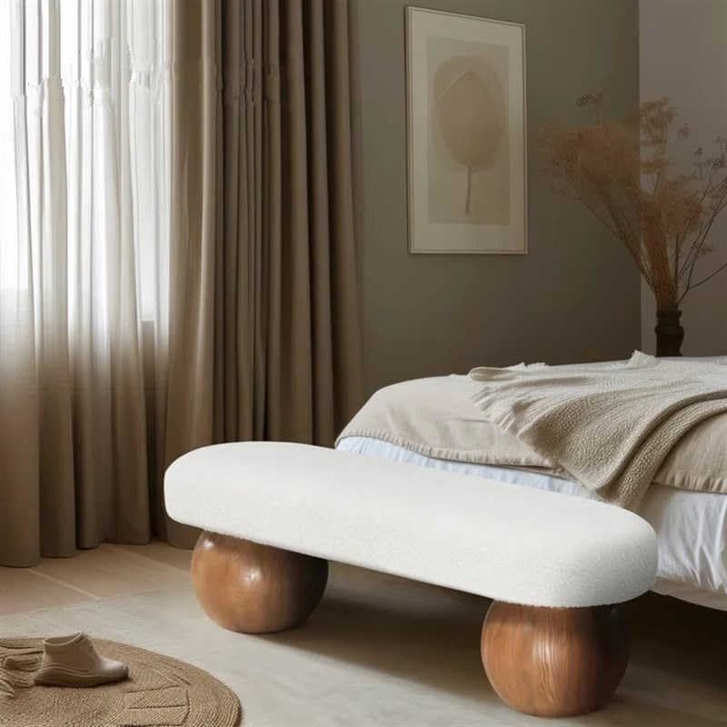 Product description: Transform your living space with this Nordic minimalist upholstered bench from Interoknack. The elegant design combines a plush, creamy white boucle fabric seat with distinctive walnut-colored spherical wooden legs, creating a striking sculptural piece that enhances any room. Measuring 31.5x13.8x16.9 inches, this versatile bench works beautifully as seating in living rooms, bedrooms, or entryways. The solid wood construction provides stability and durability, while the thick cushioned upholstery ensures comfortable seating for daily use. Perfect for modern, Scandinavian, or mid-century styled spaces, this fully assembled bench offers both functionality and sophisticated style. The neutral tones and organic shapes make it an ideal accent piece that seamlessly integrates into various interior designs, from cozy apartments to spacious homes. Whether used for changing shoes, casual seating, or as a decorative element, this bench combines practicality with contemporary aesthetics.