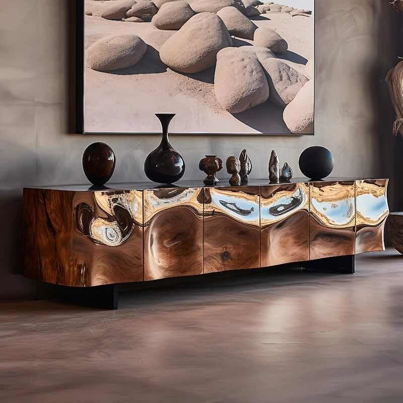 interoknack Designer Sculptural Walnut TV Stand, Luxury Postmodern Media Console