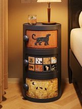 Product description: Transform your bedroom with this innovative 3-tier round nightstand that masterfully combines form and function. At 26 inches tall with a compact 14.2-inch diameter, this cylindrical marvel maximizes vertical storage while preserving precious floor space. Each rotating tier showcases stunning artistry - from exotic leopard prints to elegant botanical motifs - turning everyday storage into a decorative masterpiece. The steel construction ensures lasting durability, while smooth-operating drawers provide ample space for bedside essentials. An integrated LED accent light crowns the design, offering subtle illumination for nighttime convenience. Perfect for small spaces, studio apartments, or anyone seeking a creative alternative to traditional nightstands, this fully assembled piece delivers sophisticated storage without compromise. The three-tier organization system includes varied compartments for versatile storage options, all within an efficiently designed footprint that fits where conventional nightstands cannot.