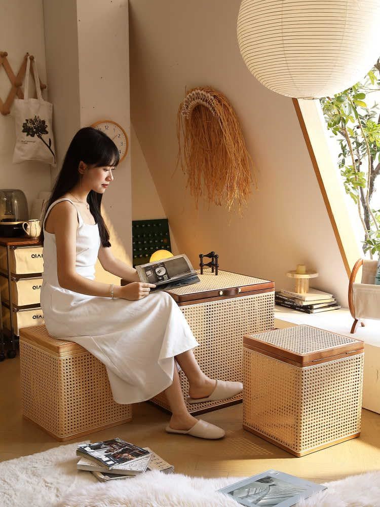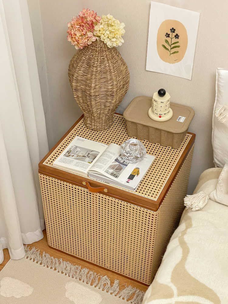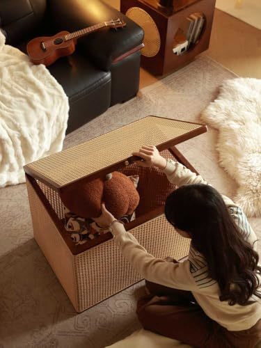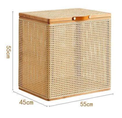 Product description: Transform your living space with this generously-sized vintage rattan storage box that masterfully combines style and functionality. The handwoven rattan panels, set within a rich cherry-finished wooden frame, create an elegant piece measuring 21.7 inches in width, depth, and height. Perfect for decluttering any room, this versatile storage solution features a practical hinged lid that keeps contents neatly concealed while allowing easy access. The breathable rattan construction makes it ideal for storing linens, seasonal clothing, toys, or miscellaneous items. Double as a charming side table or casual seating option, this lightweight piece includes an integrated handle for effortless mobility. The timeless design complements various interior styles from Scandinavian to mid-century modern, making it a sophisticated addition to bedrooms, living rooms, or entryways. The natural warmth of the materials and classic craftsmanship bring both beauty and organization to your home.