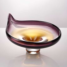 Product description: Elevate your home decor with this exquisite handcrafted art glass pedestal fruit bowl. The stunning purple-to-amber gradient creates a mesmerizing visual journey, transitioning from deep plum edges through delicate rose tones to a warm golden center. Its organic wave-like design captures the fluid essence of molten glass, frozen in a moment of perfect balance. Standing 7.1 inches tall with a generous 14 x 11.4-inch oval serving surface, this substantial piece weighs 8.4 pounds, ensuring stability while making a bold artistic statement. The elevated pedestal base transforms this functional serving piece into a sculptural masterpiece, perfect as a contemporary centerpiece for modern living spaces. Whether displaying fresh fruit or standing alone as an art piece, this bowl's flowing asymmetrical curves and seamless color transitions showcase exceptional artistry, making it an ideal focal point for sophisticated interiors.