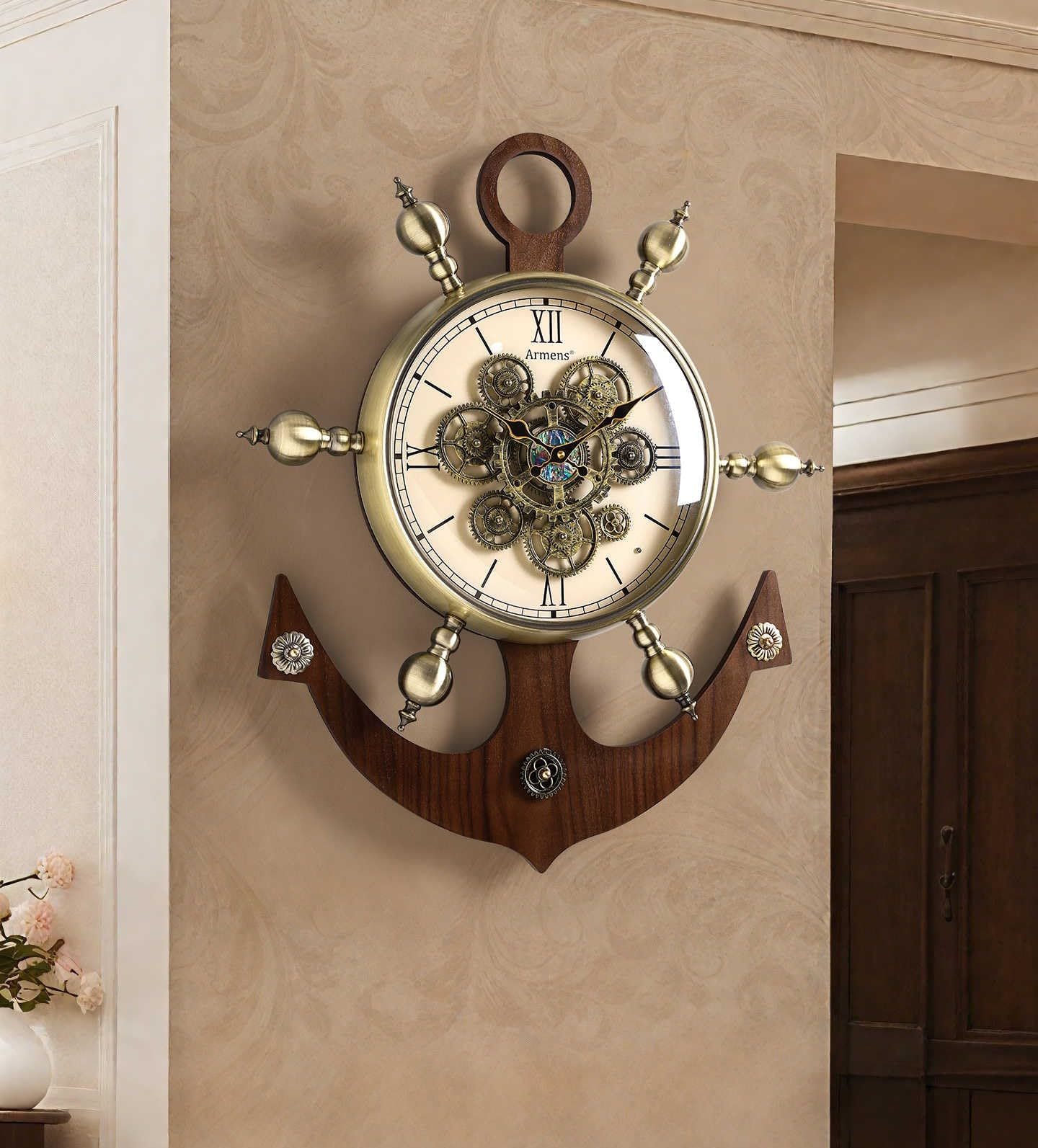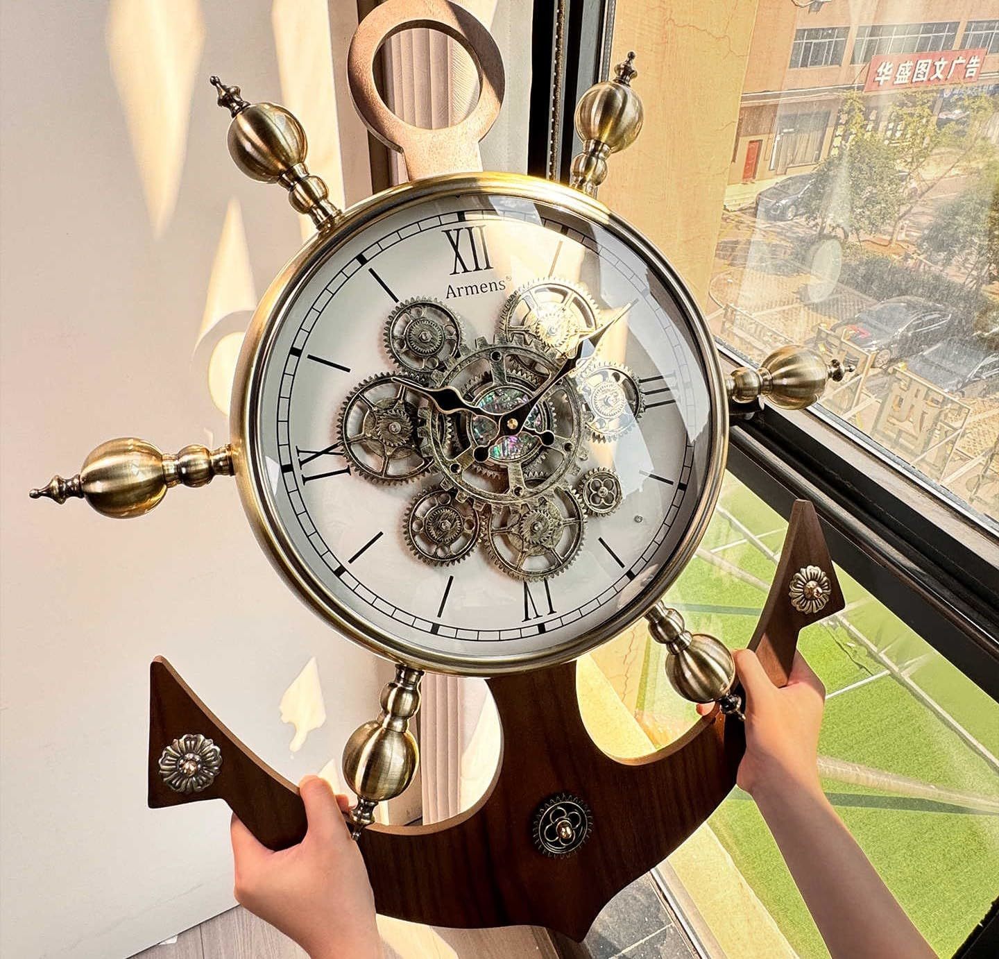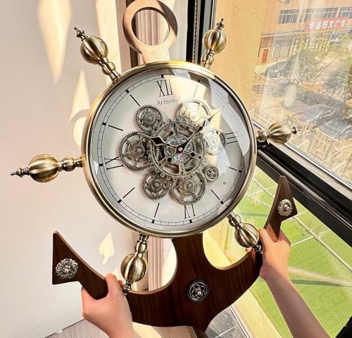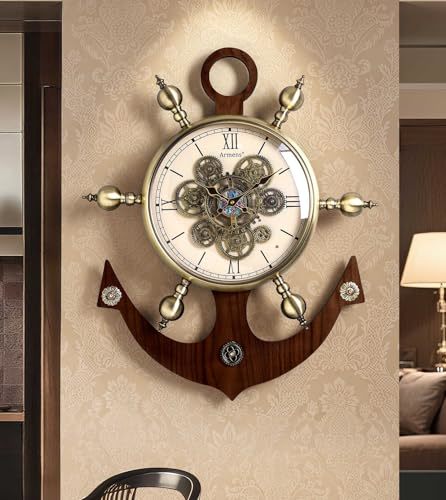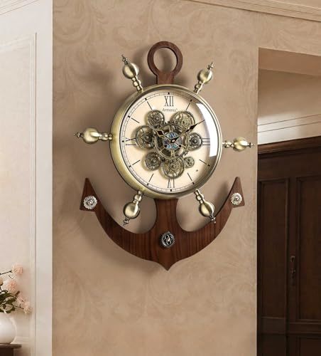 Product description: Transform your space with this stunning European vintage gear wall clock featuring a distinctive nautical ship anchor design. At an impressive 27.4 inches tall and 22.6 inches wide, this statement piece combines the timeless appeal of a ship's wheel with intricate antique-gold gearwork at its center. The open-face design showcases elegant Roman numerals and vintage-style hands, creating a mesmerizing mechanical display that serves as both a functional timepiece and sophisticated wall art. The harmonious blend of warm wood textures and metallic accents delivers a luxurious presence, while the precise quartz movement ensures reliable timekeeping. Perfect for living rooms, studies, or hallways, this clock's detailed ornamentation and classic maritime elements make it an eye-catching focal point that elevates any interior design scheme from modern to traditional.