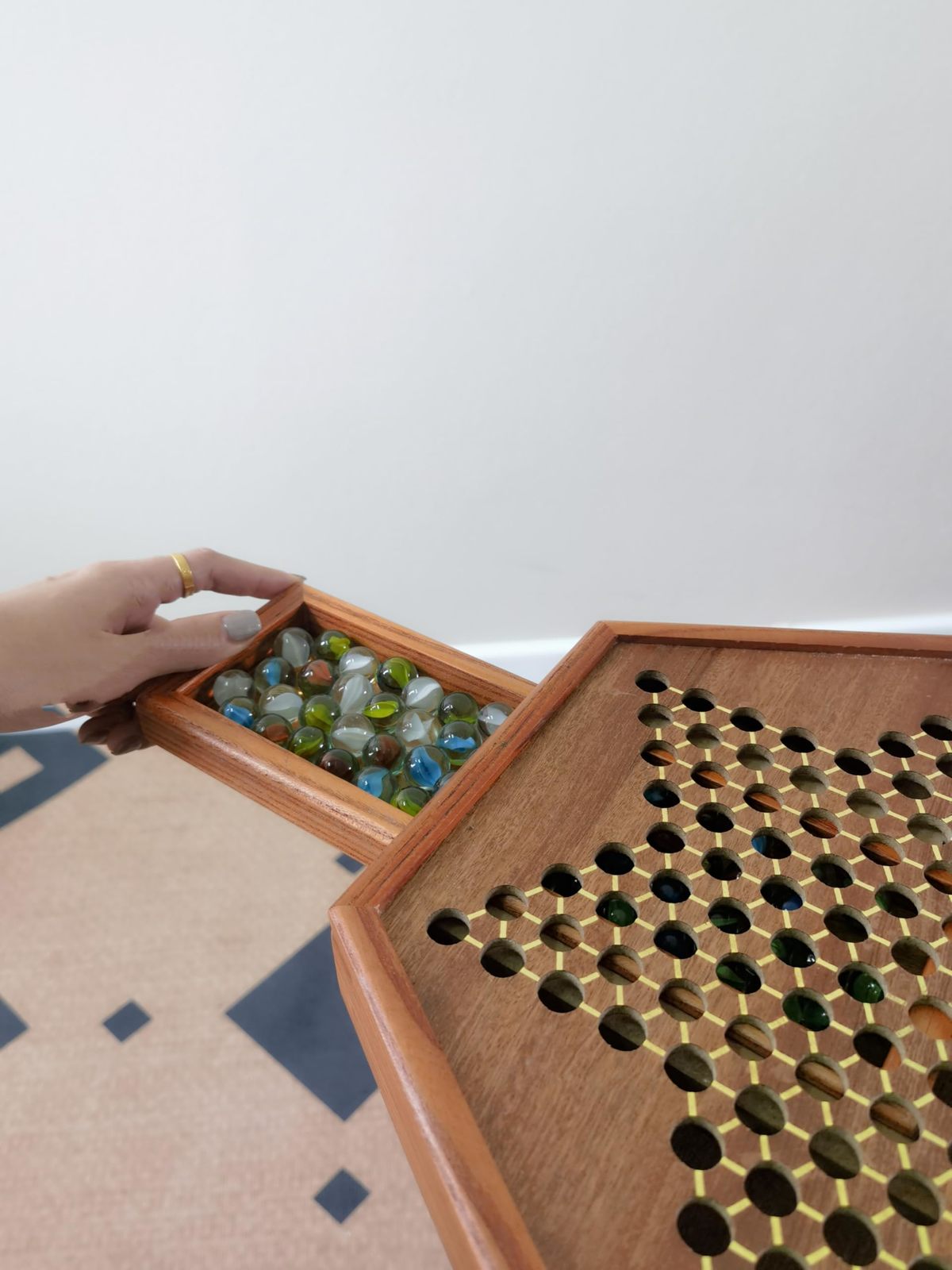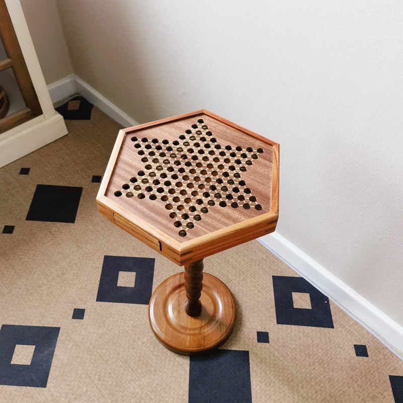 Product description: Transform your living space with this exquisite Walnut Wood Checkers Side Table that masterfully blends gaming entertainment with Nordic furniture design. The hexagonal tabletop features a meticulously crafted game board with 121 precision-drilled holes for marble gameplay, while serving as a sophisticated 32cm accent table. Crafted from premium walnut wood, the table showcases stunning natural grain patterns that complement both contemporary and traditional interiors. The thoughtfully designed storage drawer keeps gaming pieces organized and concealed when not in use. Standing at 60cm tall, the elegant turned pedestal base provides stable support while exemplifying classic woodworking craftsmanship. This versatile piece works beautifully as a side table, bedside companion, or distinctive accent table, making it perfect for small spaces while offering an interactive entertainment element. The clean geometric lines and natural wood finish reflect signature Nordic minimalism, creating a conversation piece that elevates any room's decor while providing endless opportunities for social connection through traditional gameplay.