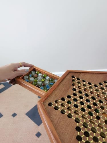 Transform your living space with this exquisite Walnut Wood Checkers Side Table that masterfully blends gaming entertainment with Nordic furniture design. The hexagonal tabletop features a meticulously crafted game board with 121 precision-drilled holes for marble gameplay, while serving as a sophisticated 32cm accent table. Crafted from premium walnut wood, the table showcases stunning natural grain patterns that complement both contemporary and traditional interiors. The thoughtfully designed storage drawer keeps gaming pieces organized and concealed when not in use. Standing at 60cm tall, the elegant turned pedestal base provides stable support while exemplifying classic woodworking craftsmanship. This versatile piece works beautifully as a side table, bedside companion, or distinctive accent table, making it perfect for small spaces while offering an interactive entertainment element. The clean geometric lines and natural wood finish reflect signature Nordic minimalism, creating a conversation piece that elevates any room's decor while providing endless opportunities for social connection through traditional gameplay.