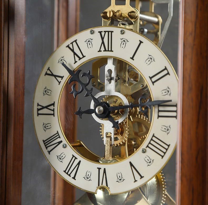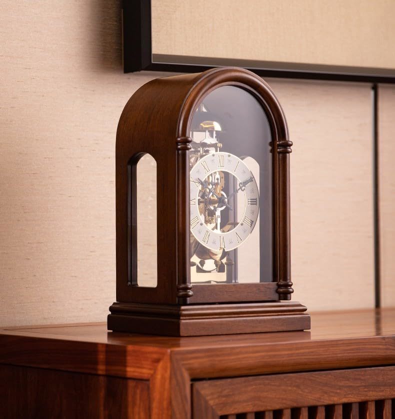 Product description: Step back in time with this exquisite mechanical mantel clock, where classic craftsmanship meets timeless design. The solid wood case, measuring 32 cm in height, features an elegant arched top and distinguished column accents that frame the mesmerizing mechanical movement. Through crystal-clear glass panels on all sides, witness the hypnotic dance of polished brass gears and swinging pendulum - a testament to traditional horological artistry. The face presents refined Roman numerals paired with ornate black hands, creating a sophisticated focal point for any room. This substantial timepiece, weighing 2.35 kg, commands attention whether placed on a desk, mantel, or bookcase. The manual winding mechanism offers a authentic connection to centuries of clockmaking tradition, making this more than just a timekeeper - it's a conversation piece that brings character and refinement to any interior space. Perfect for collectors and enthusiasts of vintage-inspired decor, this clock serves as both a functional instrument and an architectural accent piece.