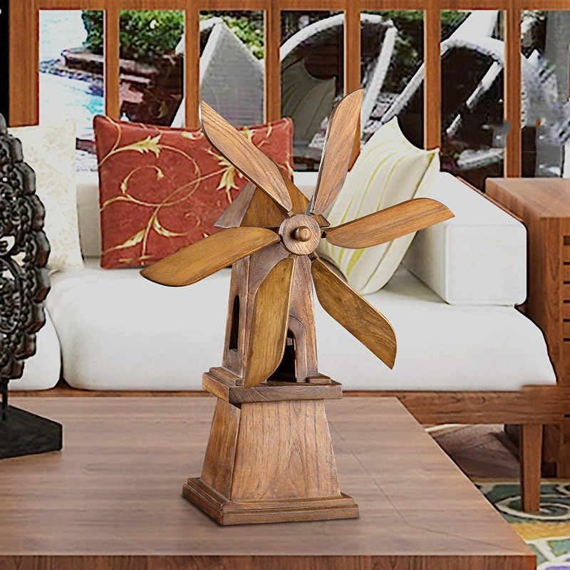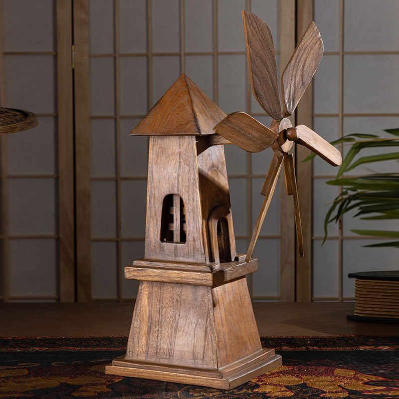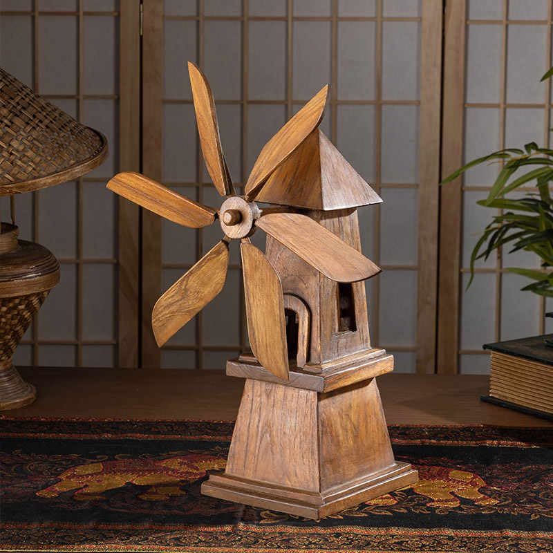 Product description: Transform your living space with this captivating Thai handcrafted wooden windmill sculpture, a masterpiece that marries European countryside charm with Southeast Asian artistry. Standing at approximately 13.6 inches tall, this desktop masterpiece showcases exquisite craftsmanship in every detail, from its precisely carved rotating blades to authentic architectural elements including shingled roofing and arched doorways. The eight wooden blades spin smoothly with gentle air movement, adding a mesmerizing dynamic element to your decor. Crafted from premium Southeast Asian hardwood, the sculpture's natural grain patterns and hand-finished surface create a stunning visual appeal. Its thoughtful dimensions make it perfect for desktop displays, bookshelves, or as a striking centerpiece on TV cabinets. This versatile piece serves as both a functional art piece and conversation starter, ideal for collectors of folk art or anyone who appreciates traditional craftsmanship. The classic windmill design brings pastoral elegance to any room while celebrating the rich heritage of Thai woodworking traditions.