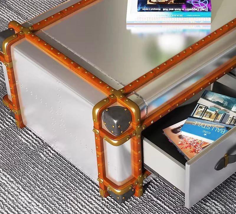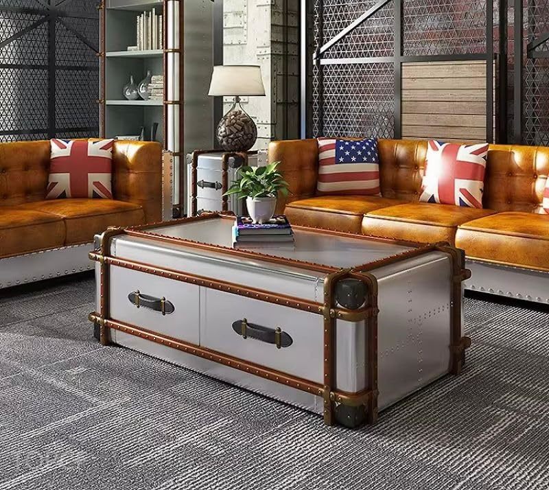 Product description: Add a bold statement to your living room with this Industrial Vintage Aluminum Coffee Table featuring a sleek aviation-inspired trunk design. Crafted with a durable aluminum body, rivet accents, and rustic leather handles, this coffee table merges modern loft style with nostalgic retro charm. With two spacious drawers, it's as functional as it is stylish?perfect for organizing books, remotes, and daily essentials.
