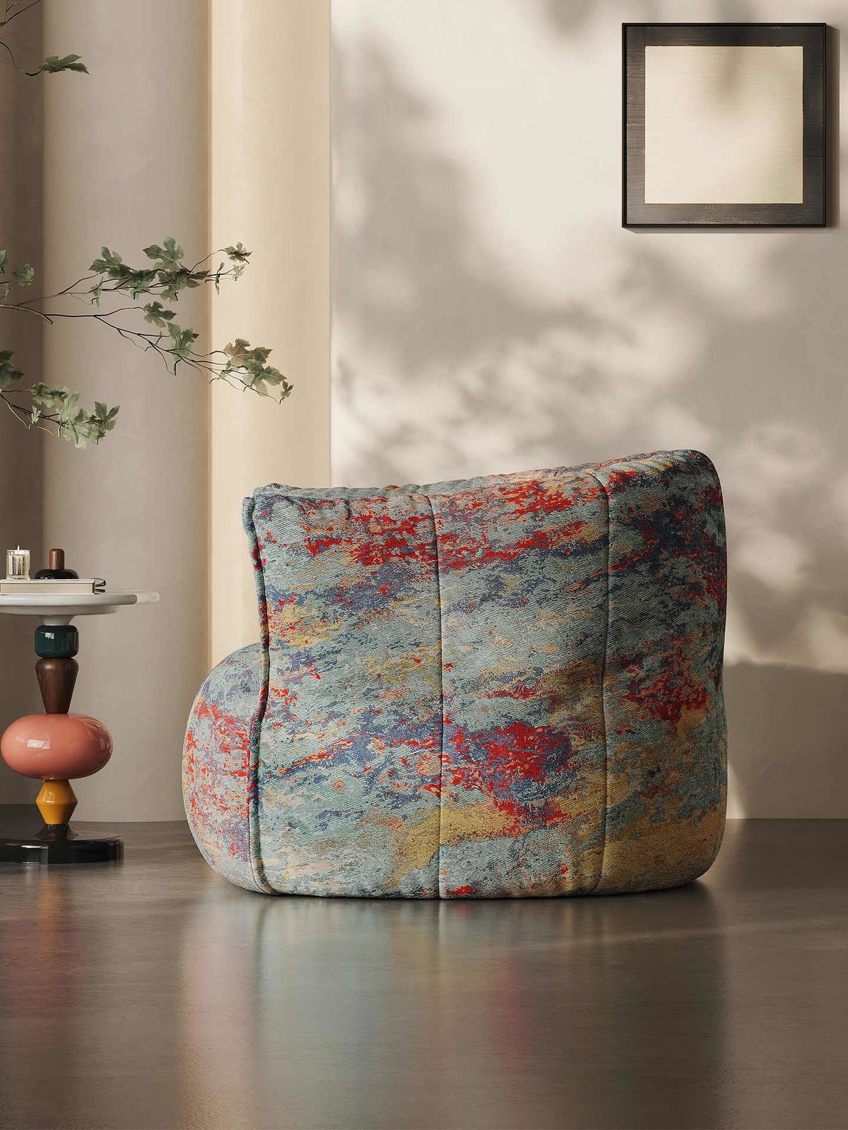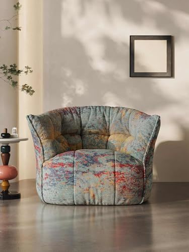Product description: Elevate your living space with this Italian Ultra-Minimalist Danxia Lounge Chair, a masterful fusion of artistry and comfort. The striking Danxia pattern adorns premium Bmigantin silk jacquard upholstery, creating a mesmerizing display of reds, blues, and earth tones that dance across the chair's surface. Measuring 40.6 inches wide, 36.6 inches deep, and 31.5 inches tall, this generously proportioned chair features 80D high-density shaped cotton filling that delivers exceptional comfort while maintaining its sculptural form. The contemporary rounded design eliminates harsh angles, embracing occupants in a cocoon-like sanctuary perfect for relaxation. Its organic curves and flowing lines create a visual masterpiece that changes character as light plays across its surface throughout the day. The floor-mounted base provides stability while preserving the chair's clean, minimalist aesthetic. This statement piece seamlessly combines sophisticated Italian design principles with luxurious materials, making it an ideal centerpiece for contemporary living rooms, art-inspired spaces, or meditation areas where comfort meets artistic expression.