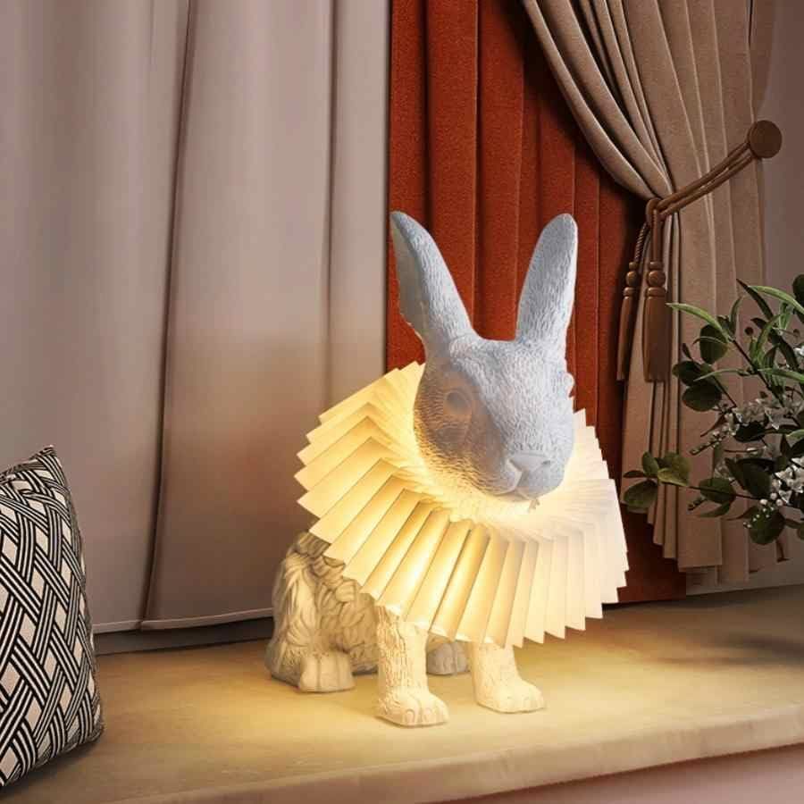 Product description: Transform any room with this charming rabbit table lamp that perfectly balances whimsy and sophistication. Standing 15.7 inches tall, this white resin lamp features a delightful pleated collar that doubles as an elegant lampshade. The built-in warm light source creates a cozy ambiance ideal for bedrooms, children's rooms, or reading nooks, effectively illuminating spaces up to 54 square feet. Available in both standing and seated poses, this Interoknack creation showcases meticulous craftsmanship with its painted finish and modern minimalist aesthetic. The lamp's versatile design makes it a delightful addition to bedside tables, desks, or shelves, appealing to both young ones and adults who appreciate distinctive decor. Its simple plug-in operation and thoughtful size make it an ideal accent piece for creating inviting spaces perfect for relaxation, bedtime stories, or quiet study sessions.