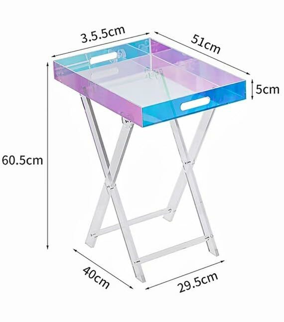 Product description: Transform your living space with this stunning iridescent acrylic folding tray table. The premium imported acrylic material creates a mesmerizing display of shifting colors that adds an artistic touch to any room. With its generous 20.1" x 15.7" surface area and 2" raised edges, this versatile piece functions beautifully as a bedside table, serving tray, or decorative accent. The thoughtfully designed cutout handles make it easy to move, while the foldable legs at 23.8" height provide both stability and convenient storage options. Perfect for modern homes, apartments, and studios, this lightweight yet durable table adapts to your needs - from displaying cherished items to serving morning coffee. The stain-resistant acrylic construction ensures lasting beauty, making it an ideal choice for busy households. Whether used as a statement piece in your living room or a practical addition to your bedroom, this multifunctional table combines style with functionality in one elegant package.