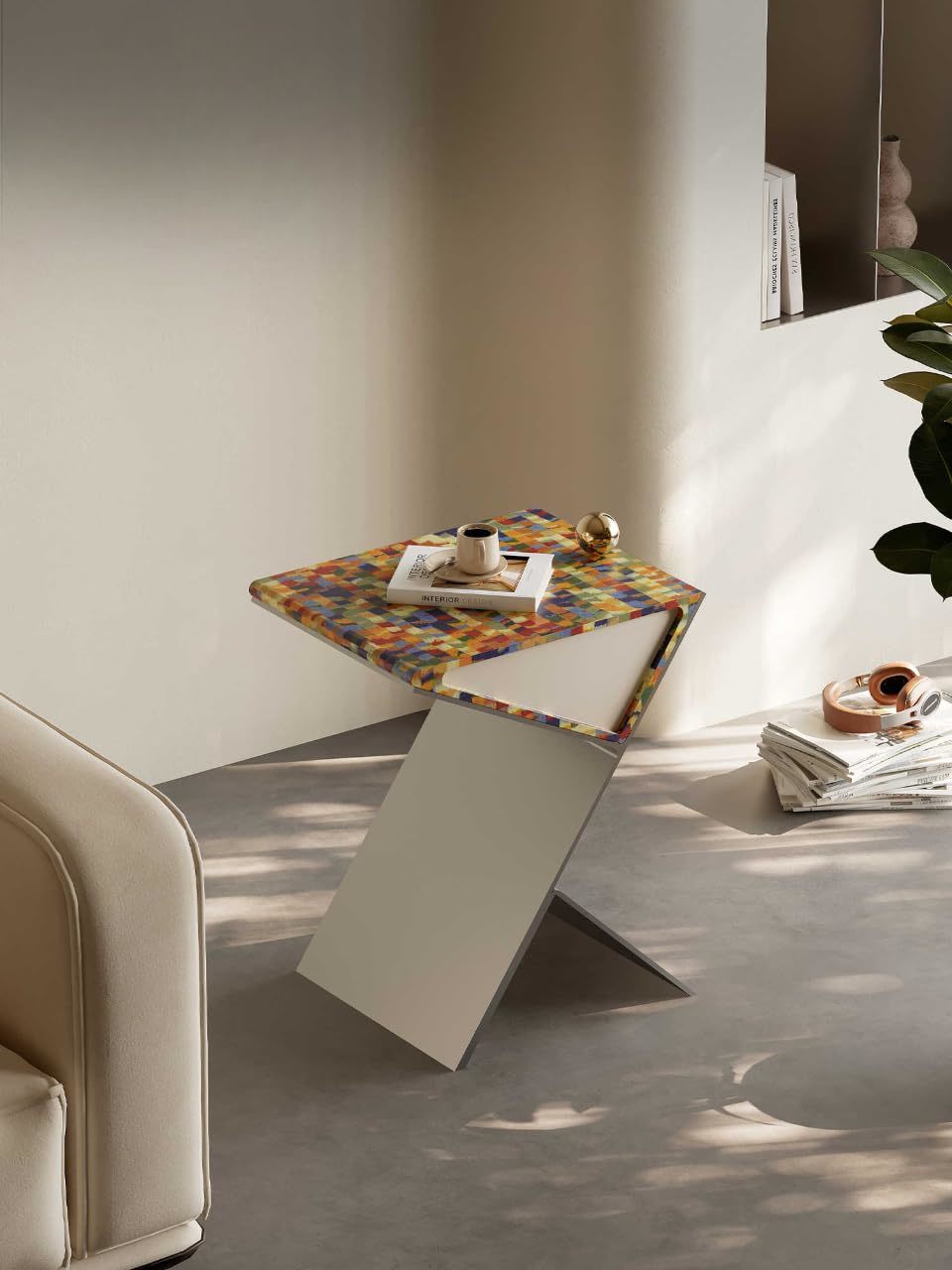 Product description: Transform your living space with this striking modern side table that masterfully blends form and function. The dramatic Z-shaped base, crafted from premium stainless steel, creates an architectural statement while providing exceptional stability. Measuring 15.7 x 12.6 x 21.7 inches, this table features a stunning triangular top made of colorful acrylic resin that creates a mesmerizing kaleidoscope effect as light plays across its surface. The multi-colored top showcases an artistic array of hues that add vibrant energy to any room, while the sculptural base appears to float effortlessly despite its robust construction. Perfect as an accent piece beside sofas or in statement corners, this contemporary furniture piece elevates ordinary side table functionality into gallery-worthy art. The mirror-like finish of the stainless steel complements both warm and cool interior palettes, making it a versatile addition to modern living spaces where both practical surface area and artistic impact are desired.