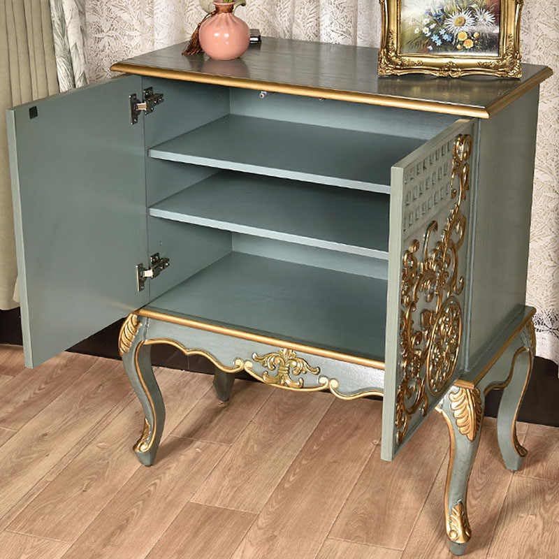 Product description: Elevate your entryway with this exquisite French Neoclassical console cabinet, masterfully crafted from solid wood with stunning baroque details. The 80x40x92cm cabinet showcases intricate hand-carved relief work featuring royal urns, floral medallions, and graceful scrollwork, all enhanced by sophisticated gold leaf accents against a refined sage green finish. Traditional cabriole legs with ornately carved aprons support this statement piece, embodying authentic 18th-century French design elements. The two-door cabinet provides practical storage with adjustable shelving, perfect for organizing entryway essentials while maintaining an air of aristocratic elegance. Each detail, from the dimensional baroque motifs to the classic proportions, reflects museum-quality craftsmanship and timeless neoclassical styling. This versatile piece functions beautifully as an entry console, dining room sideboard, or sophisticated accent furniture, bringing the grandeur of Versailles into contemporary spaces. The marriage of practical storage and exceptional artistry makes this cabinet an investment-worthy centerpiece that celebrates the finest traditions of French decorative arts.