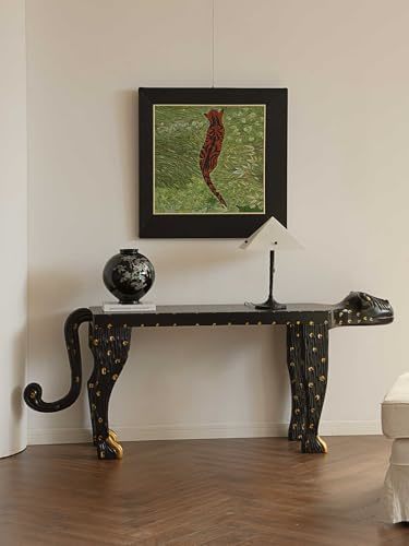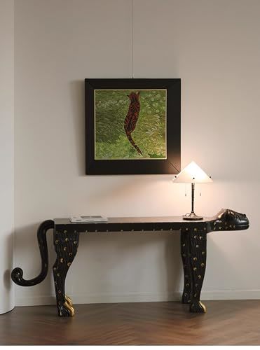 Product description: Transform your space with this magnificent Mexican Jaguar Console Table, where artistry meets functionality in a stunning display of craftsmanship. This statement piece features four masterfully hand-carved jaguar legs adorned with intricate spotted patterns and lustrous gold accents that capture the majestic essence of these powerful felines. The sleek black lacquered tabletop, measuring 70.9 inches wide by 15.6 inches deep, provides an elegant contrast while offering generous display space. Standing 29.9 inches tall, this solid wood console seamlessly merges traditional Mexican woodworking techniques with contemporary sophistication. Each jaguar leg showcases meticulous attention to detail, celebrating the sacred symbolism of jaguars in Mesoamerican culture. Whether gracing an entryway, living room, or gallery space, this extraordinary piece serves as both a functional console and a captivating work of art that commands attention and sparks conversation.