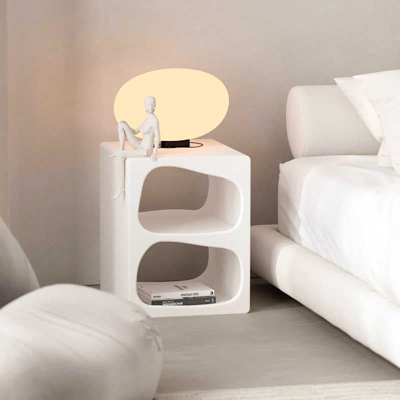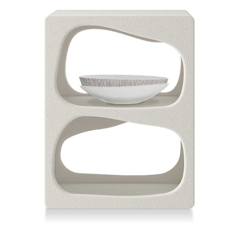Product description: Elevate your living space with this striking modern sculptural side table that seamlessly blends artistic design with practical functionality. The table's flowing organic curves and irregular geometric openings create an enchanting interplay of light and shadow, making it a captivating focal point in any room. Measuring 35x40x45cm, this versatile piece features two curved storage compartments perfect for organizing books, remotes, or decorative objects. The clean white finish and Nordic-inspired silhouette complement contemporary interiors while adding sophisticated visual interest. The subtly textured surface adds depth while maintaining easy care, making it ideal as a nightstand, living room accent, or display piece. This fully assembled table combines space-efficient design with artistic expression, transforming ordinary spaces into showcases of modern style. The durable construction ensures lasting beauty, while the sculptural form serves as functional art that instantly elevates your home's aesthetic.