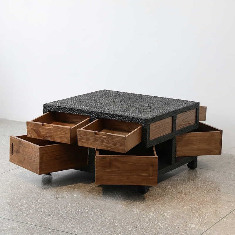 Transform your living space with this exquisite Contemporary Square Coffee Table that embodies Japanese wabi-sabi design principles. The striking 31.5-inch square table features a textured black frame complemented by weathered solid wood drawer fronts, each displaying unique grain patterns and natural character marks. Standing 18.9 inches tall, this sophisticated piece balances visual intrigue with practical functionality through four smooth-sliding storage compartments perfect for organizing living room essentials. The thoughtfully crafted design celebrates the beauty of imperfection, where the interplay between the heavily textured frame and natural wood elements creates a compelling focal point. Each table tells its own story through distinctive wood variations, making it an ideal centerpiece for contemporary homes, meditation spaces, or boutique settings seeking furniture with authentic character. The robust construction and considered proportions ensure this table serves both as a practical surface and an artistic statement piece that grows more distinctive with time.