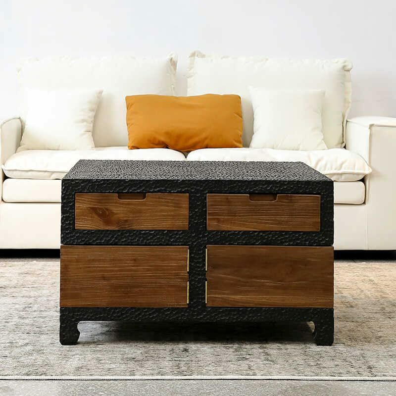 Product description: Transform your living space with this exquisite Contemporary Square Coffee Table that embodies Japanese wabi-sabi design principles. The striking 31.5-inch square table features a textured black frame complemented by weathered solid wood drawer fronts, each displaying unique grain patterns and natural character marks. Standing 18.9 inches tall, this sophisticated piece balances visual intrigue with practical functionality through four smooth-sliding storage compartments perfect for organizing living room essentials. The thoughtfully crafted design celebrates the beauty of imperfection, where the interplay between the heavily textured frame and natural wood elements creates a compelling focal point. Each table tells its own story through distinctive wood variations, making it an ideal centerpiece for contemporary homes, meditation spaces, or boutique settings seeking furniture with authentic character. The robust construction and considered proportions ensure this table serves both as a practical surface and an artistic statement piece that grows more distinctive with time.